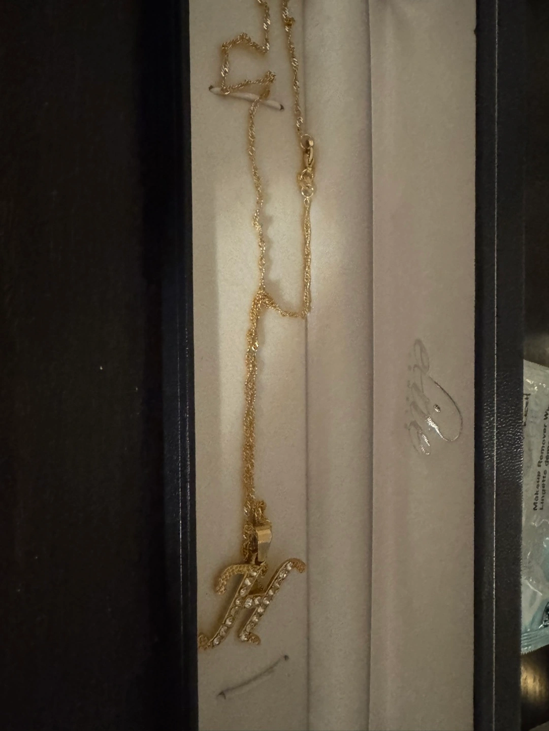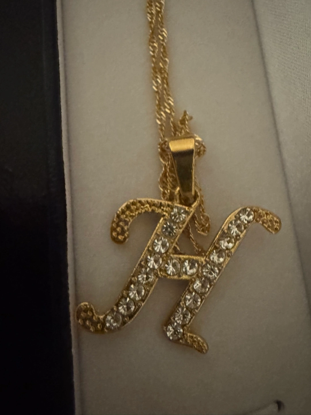 Gorgeous gold-tone necklace. Features a cursive letter H pendant encrusted with clear crystals. Delicate chain. Presented in a jewellery box. Perfect gift.