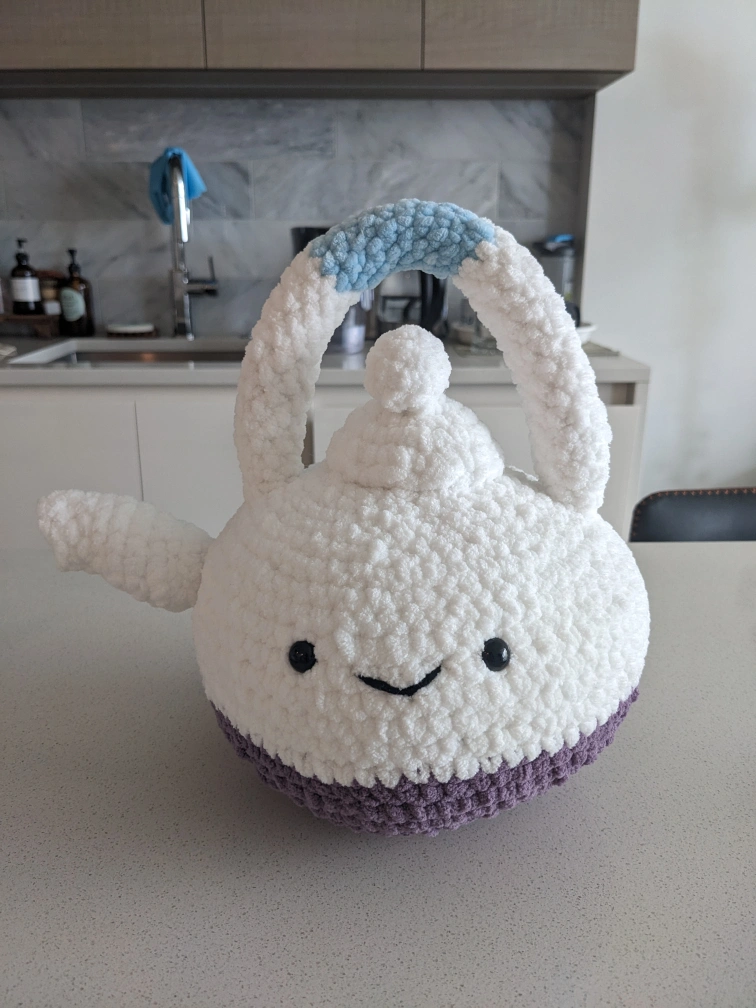 Hand-crocheted teapot. White body with light blue and purple accents.