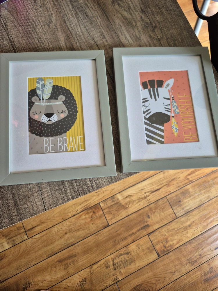 Cute framed prints featuring a lion and a zebra. Each print has inspirational text. Light grey frames. Perfect for a child's room.
