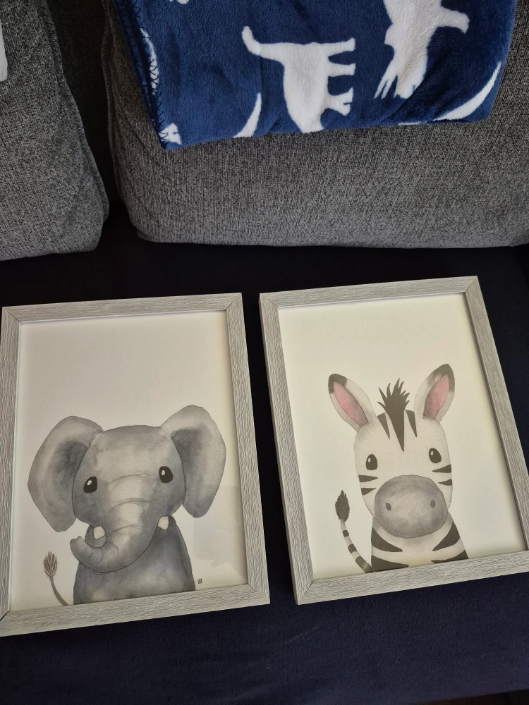 Cute watercolour animal prints. Elephant and zebra designs. Grey frames. Perfect for a nursery or child's room.