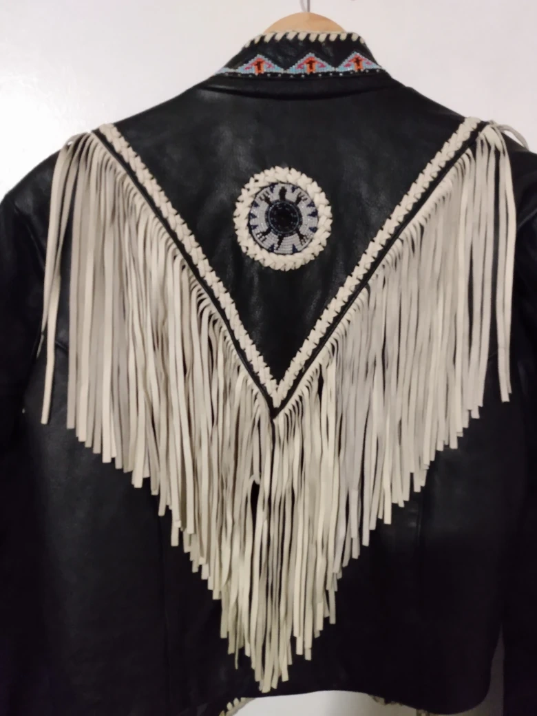 8Beautiful black leather jacket. Features intricate beadwork and off-white leather fringe. Size Large. Classic style.