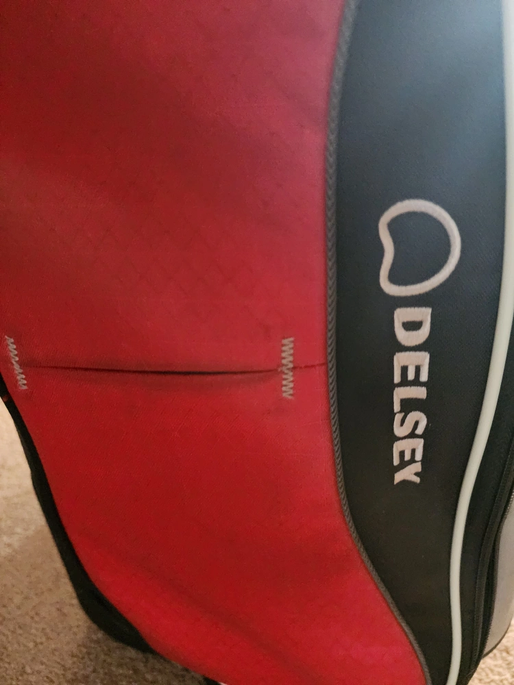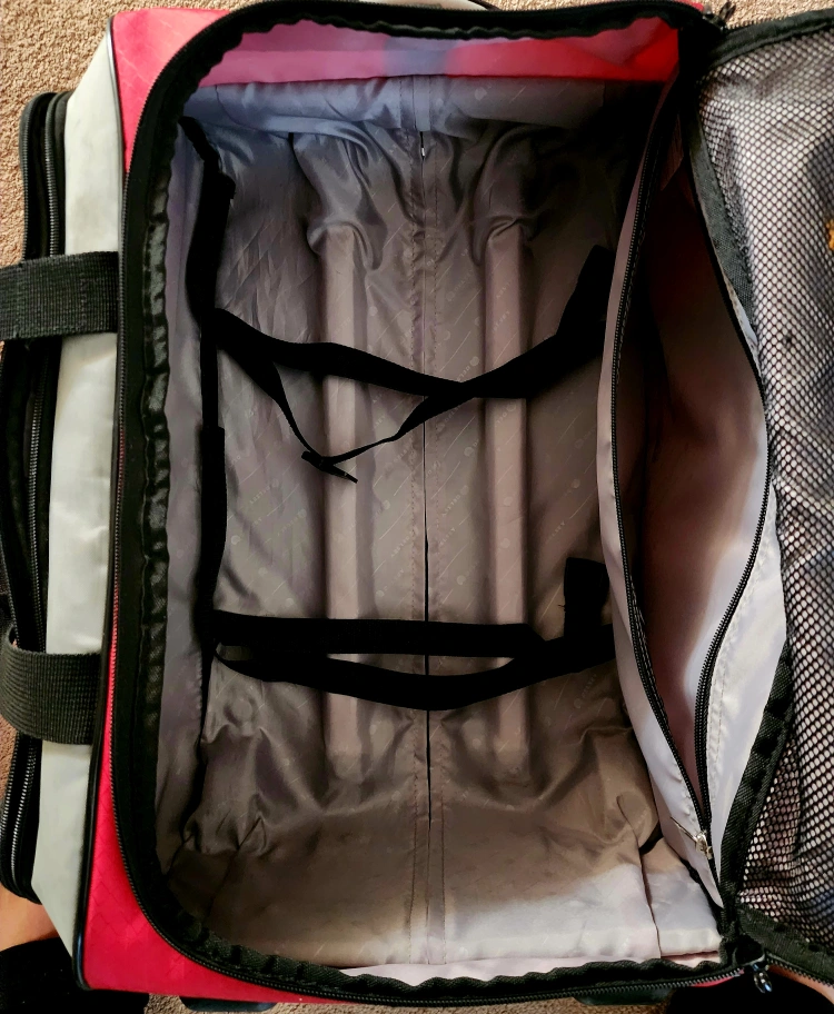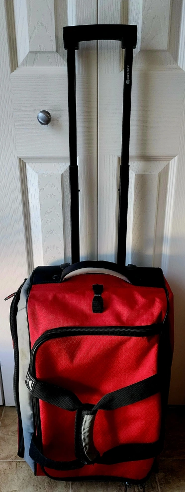 Red rolling duffle bag. Features telescopic handle and inline skate wheels. Multiple pockets and compartments. Great for travel or sports.