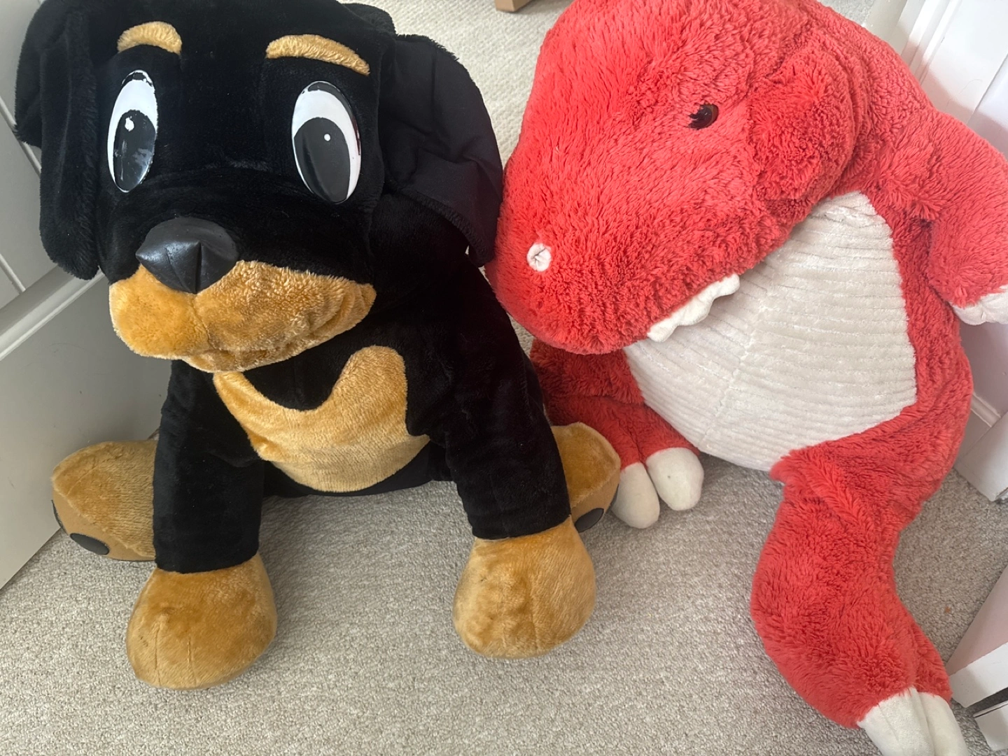 Two large plush toys. One is a Rottweiler puppy and the other a red Tyrannosaurus Rex. Great for kids or collectors.