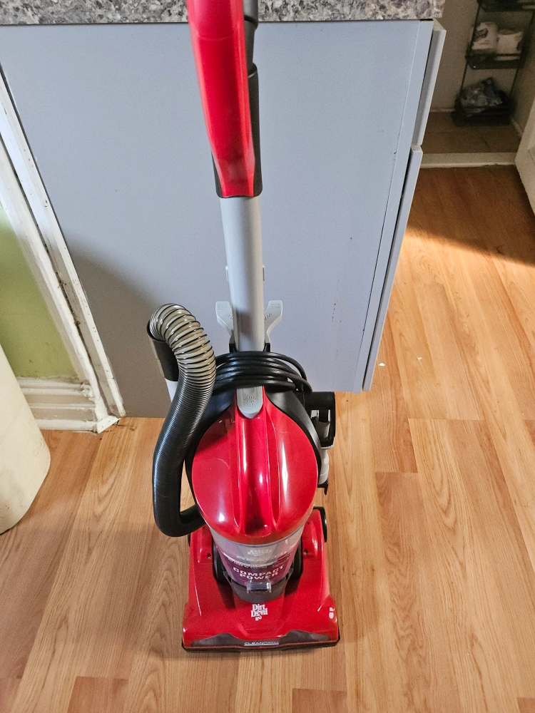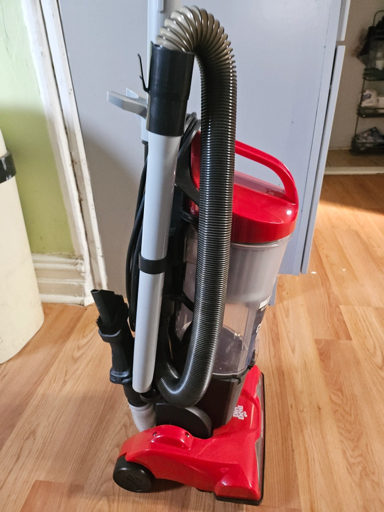 Red upright vacuum. Compact design. Includes attachments. Good for small spaces.