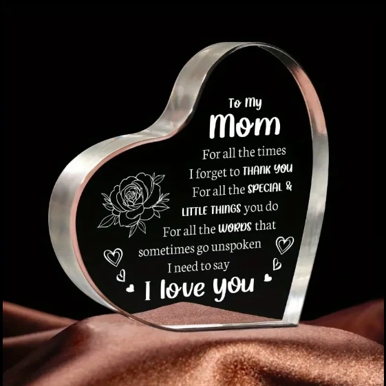 Crystal clear high-quality acrylic heart-shaped plaque. Engraved message expresses love and appreciation for Mom. Perfect Mother's Day gift. Measures approximately 3.9 inches.