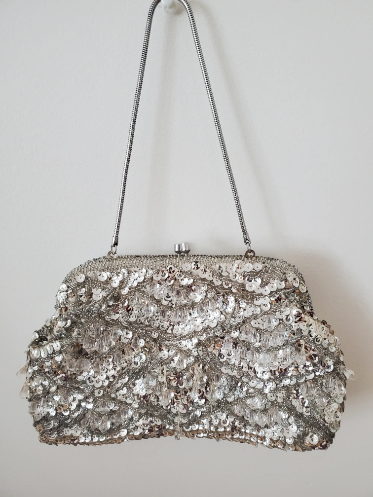 Gorgeous vintage evening bag. Silver sequins. Metal chain strap. Classic design. Perfect for a special occasion.
