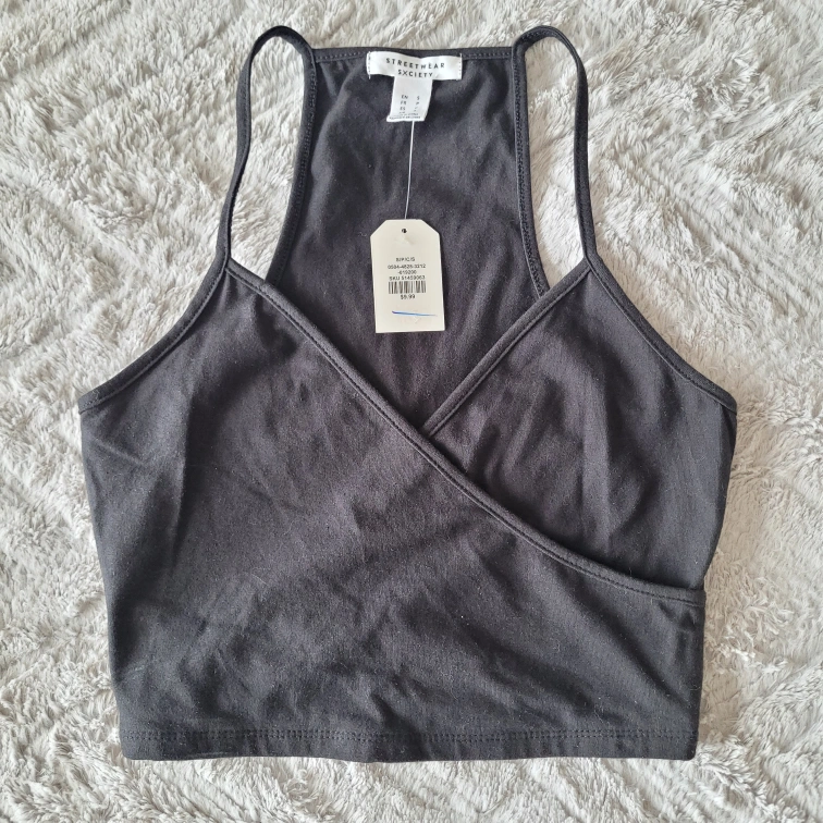 Brand new with tags. Black wrap crop top. Size small. Spaghetti straps.