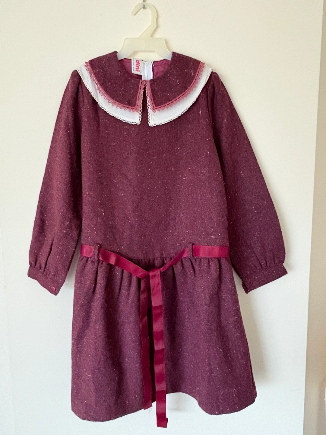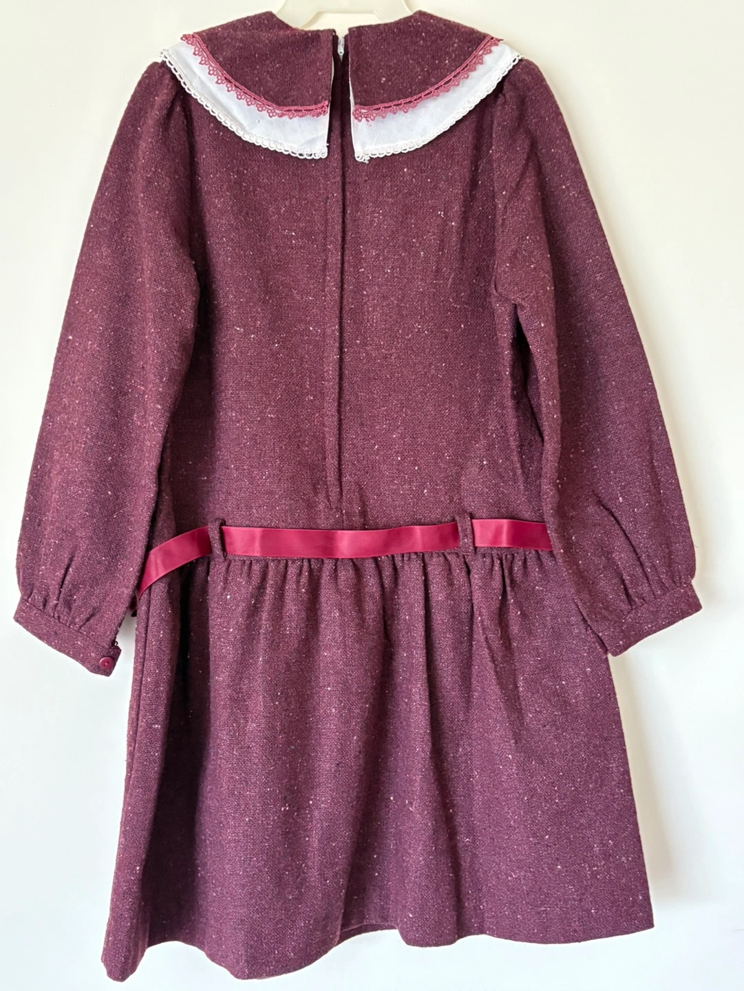 Burgundy girls' dress. Long sleeves, Peter Pan collar with lace trim. Burgundy ribbon tie at waist. Excellent condition. Size 12. The dress is 32” long.