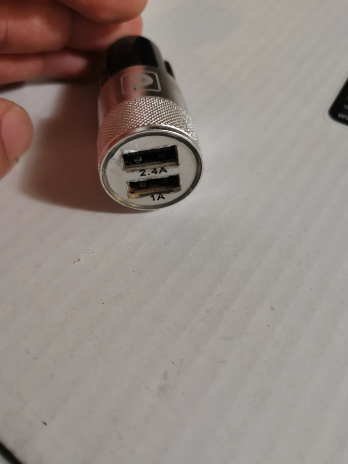Compact dual USB car charger. Features 1A and 2.4A output ports. Silver and black design. Used condition.