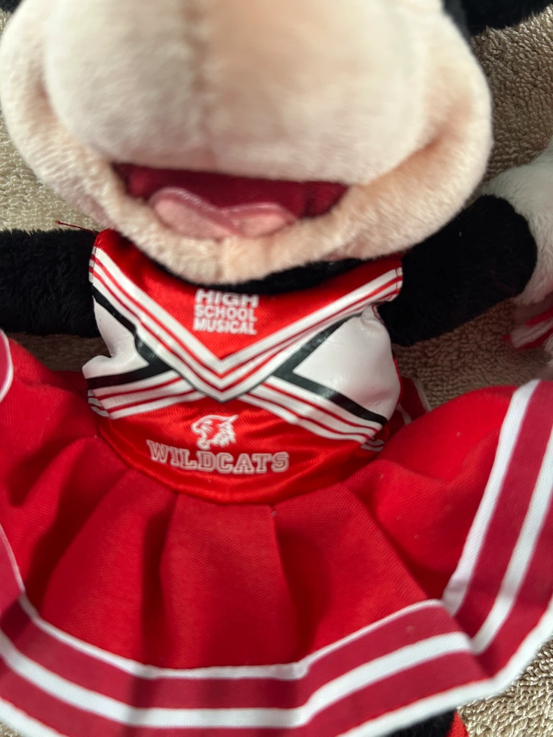 This is a Minnie Mouse plush toy dressed as a cheerleader. It has red and white pom-poms and a cheerleader outfit. From Disney World.Top reads “Wildcats “ High School Musical