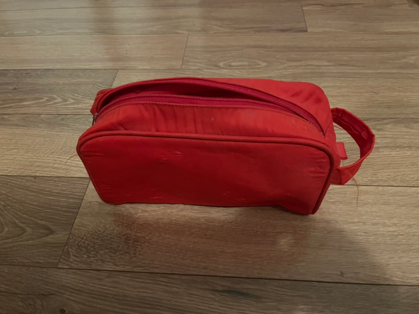 433Small red zippered travel bag. Perfect for toiletries or makeup. Features a convenient carrying handle. Not new - in fair condition. Pick up Yonge and finch