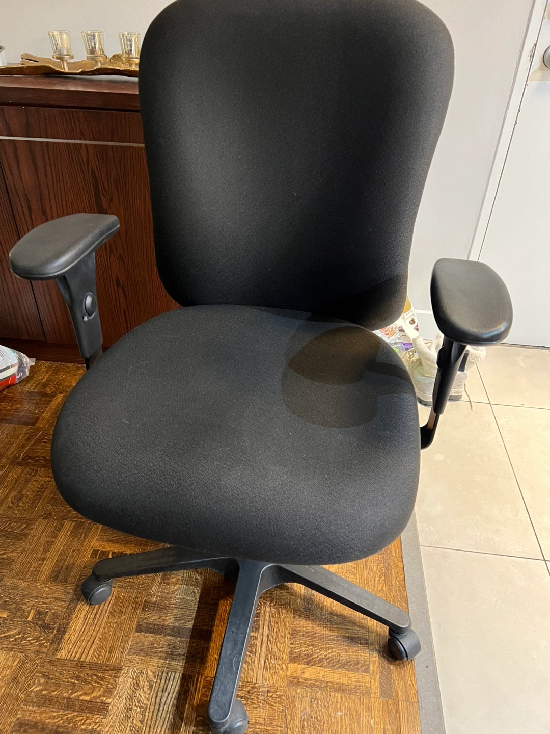 Black office chair. Features adjustable height and armrests. Five-star base with casters. Shows some wear.
