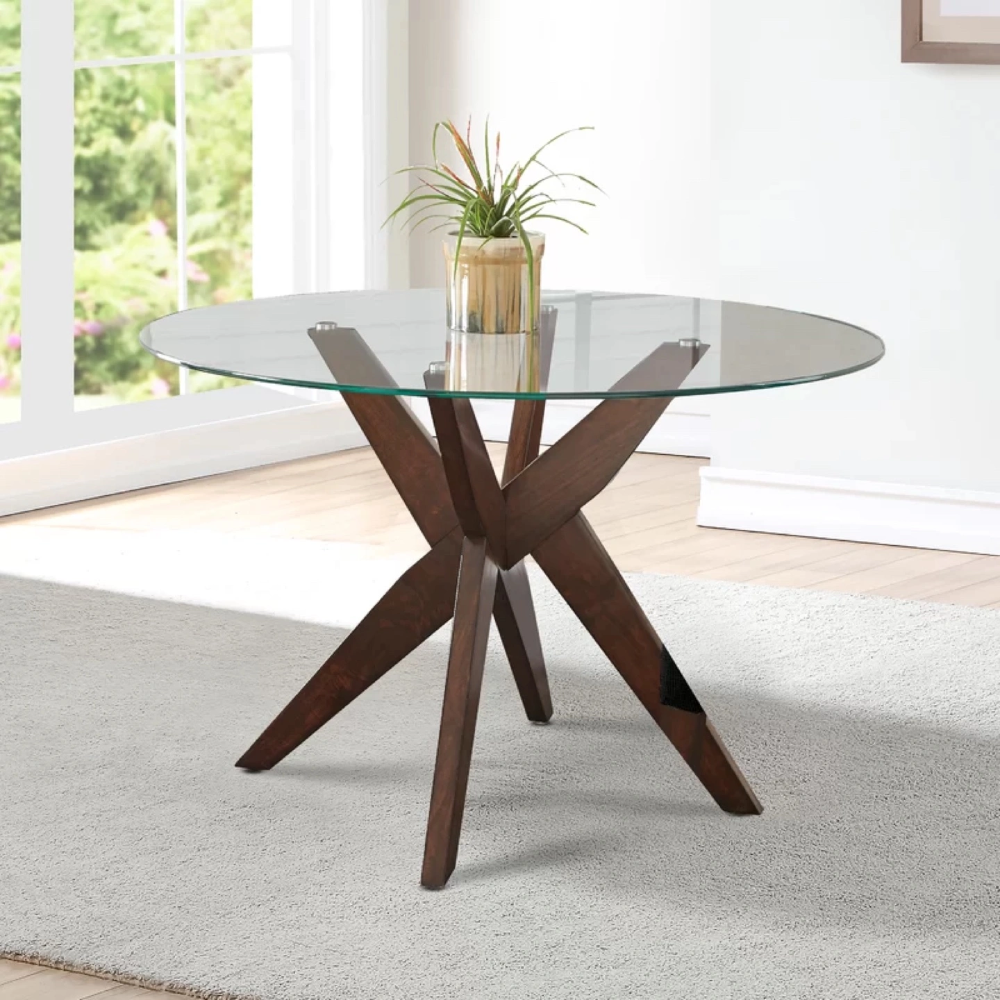 Stylish round glass dining table. Features a clear glass top and a unique dark brown wooden base. Perfect for small spaces. Modern design.