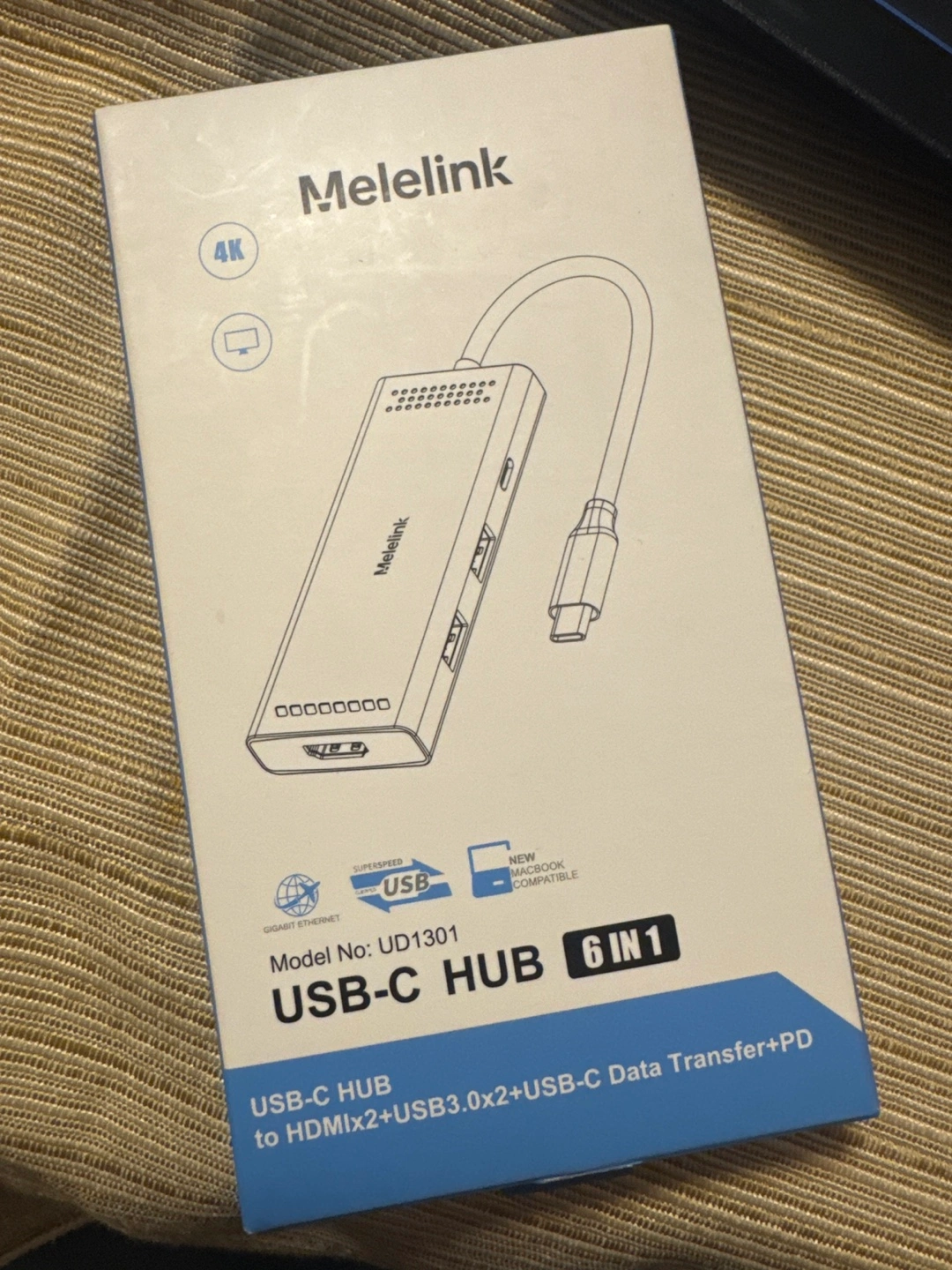 6-in-1 USB-C hub. Includes HDMI, USB 3.0 ports, and USB-C data transfer. Supports Dual 4K output. New Macbook compatible.