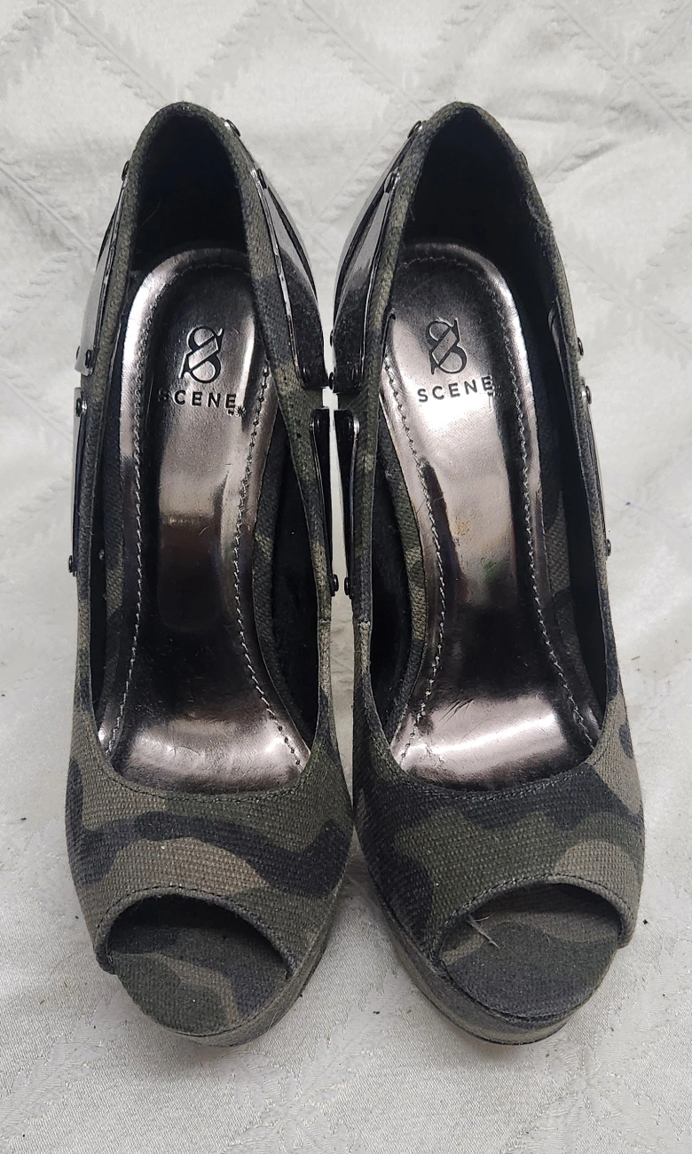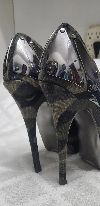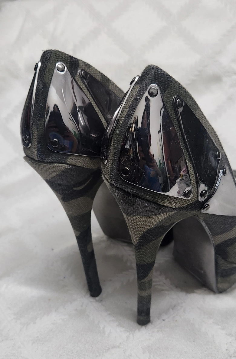 349Stylish camouflage print peep-toe platform heels. High stiletto heels. Metallic accents. Size not specified.