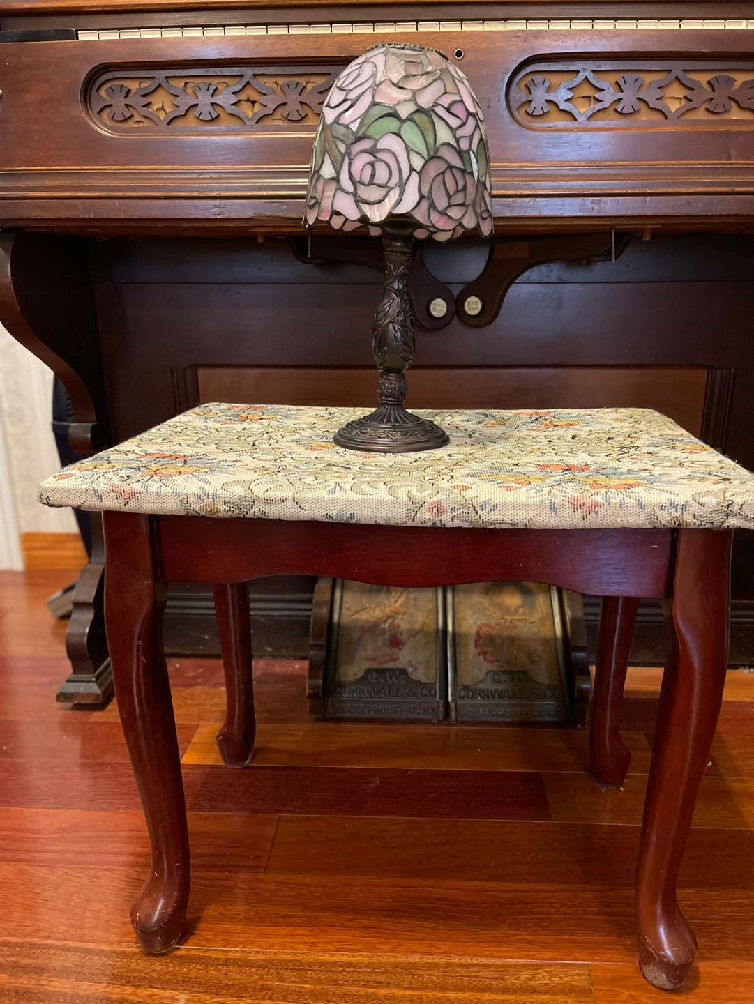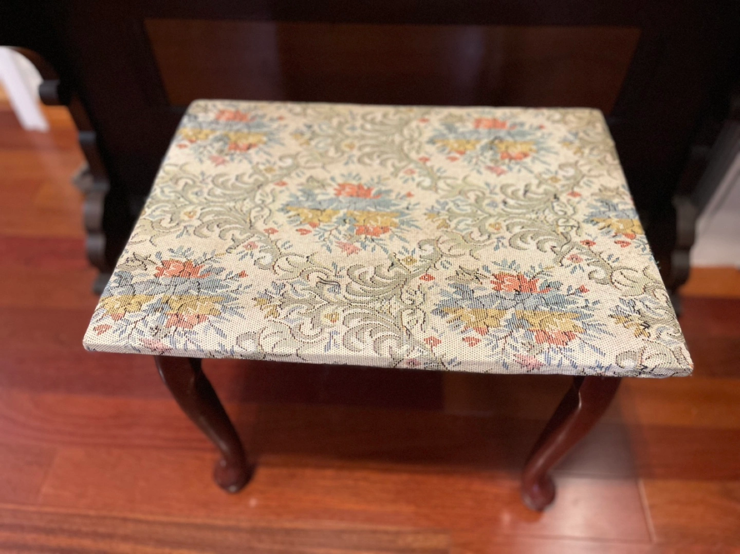 Small wooden piano bench. Features cabriole legs and a hinged seat revealing storage space. Floral patterned upholstery. Shows some minor wear.