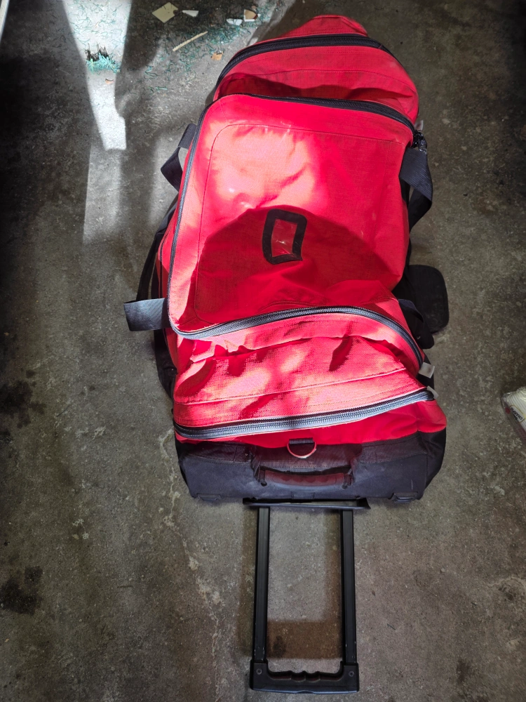 Large rolling duffle bag. Red and black colour scheme. Multiple zippered compartments. Wheels and retractable handle. Shows signs of wear.