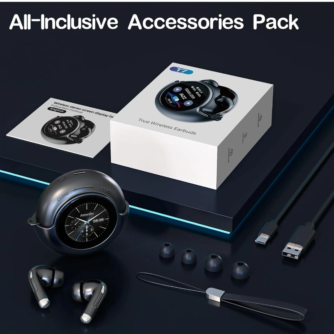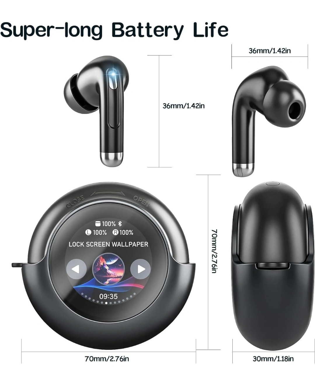 Wireless earbuds, Bluetooth 5.4. Long battery life. Includes charging case and extra ear tips. Siri compatible. Control volume, answer calls, play/pause music.