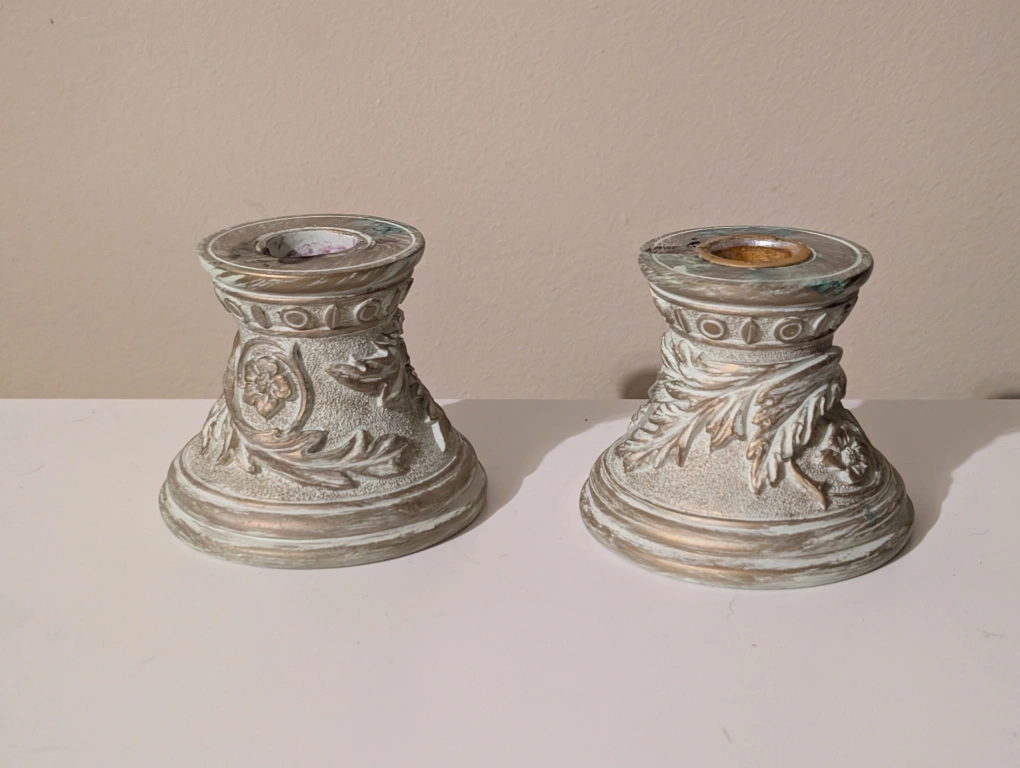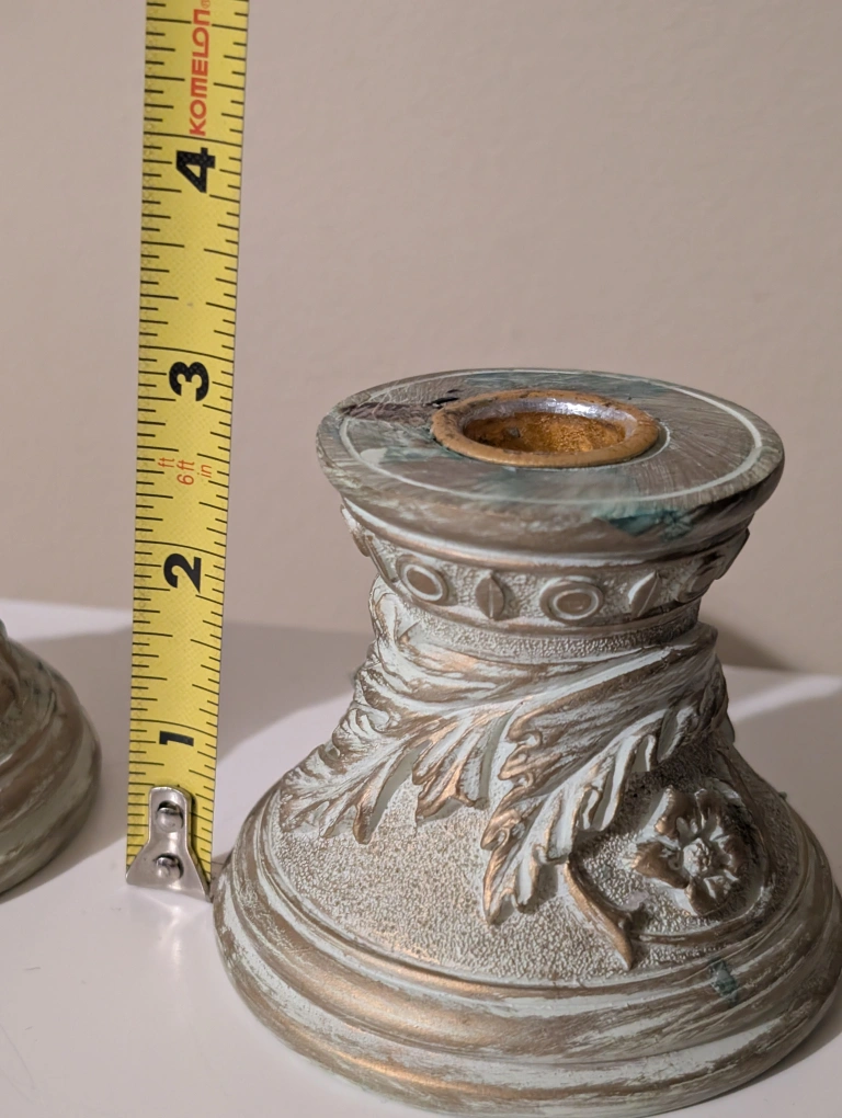 Set of two ornate candle holders. Pale green and gold finish. Intricate leaf and floral design. Small size, perfect for a table or mantelpiece.