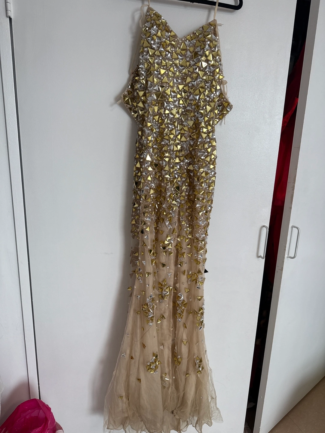 Gorgeous champagne-coloured gown. Features intricate beading with gold and clear stones. Floor-length, fitted silhouette. Beautiful for a special occasion. Pick up by today 3PM. SOME BEADS COMING OFF BUT EASY TO GLUE OR SEW.