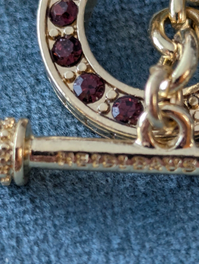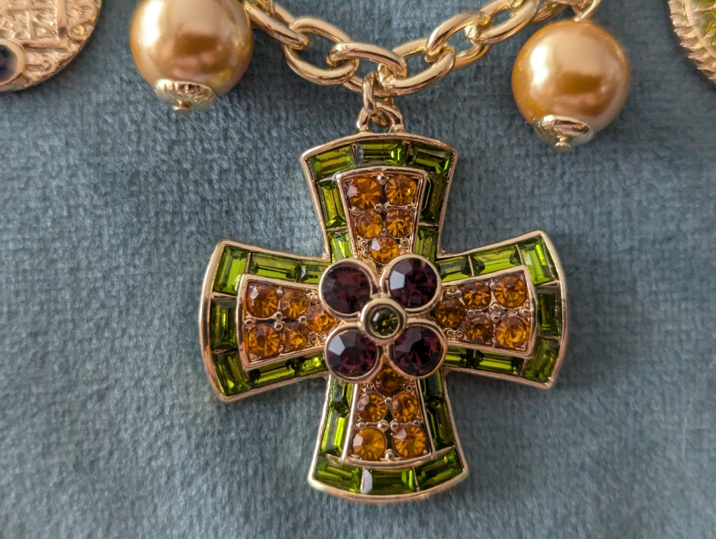 Gorgeous gold-tone necklace. Features a large cross pendant encrusted with crystals. Multiple charms and faux pearls adorn the chain. Toggle clasp.