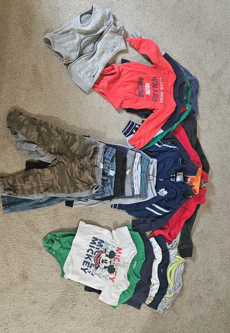 Large bundle of baby boy clothes, size 24 months. Includes pants, shirts, sweaters, and a vest. Various colours and styles.