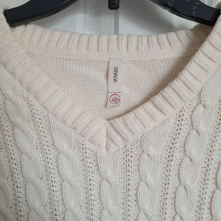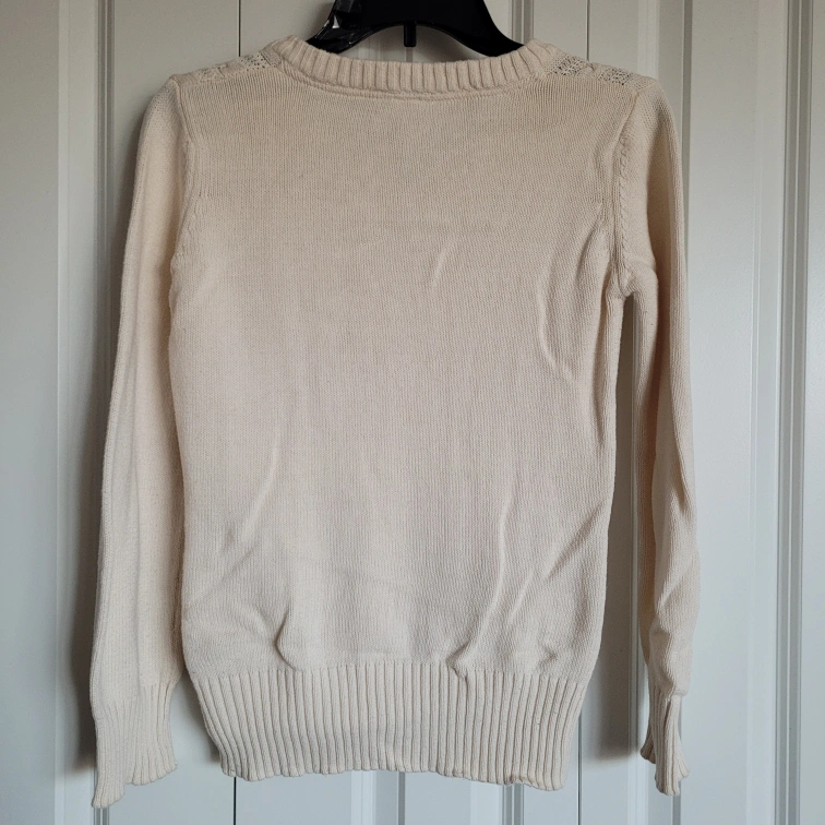 Cream-coloured cable knit sweater. Long sleeves. V-neck. Teen size large / women's size XS. Soft material. Like new condition