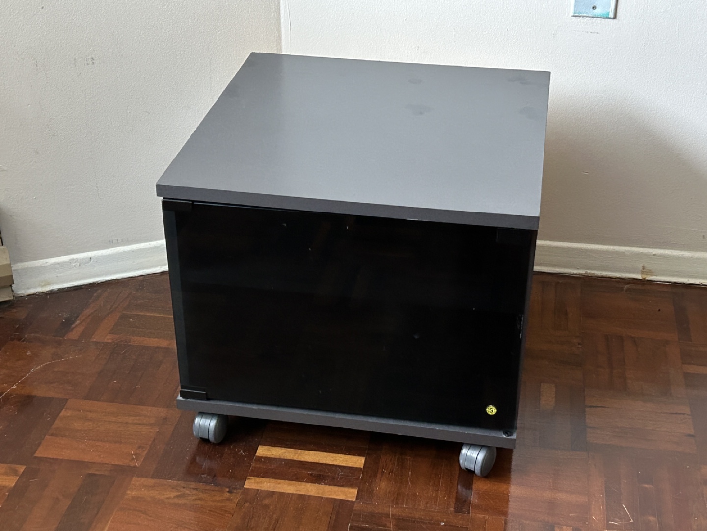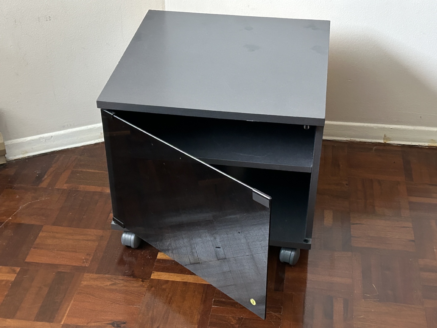 Dark grey top cabinet. Four wheels for mobility. Small shelf inside. Shelf is height adjustable and removable. Good used condition. Can be used as a TV stand, TV cart, or a bar.