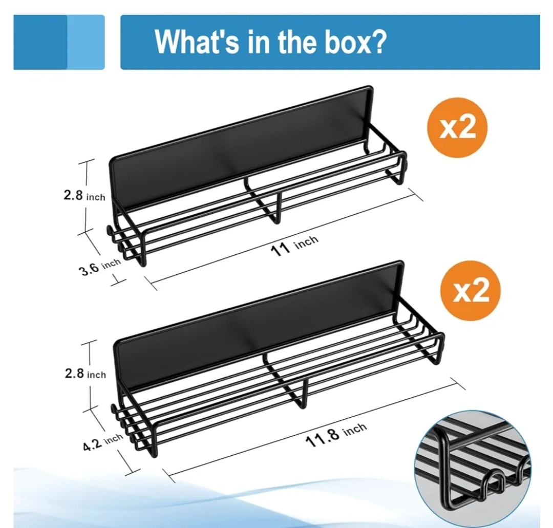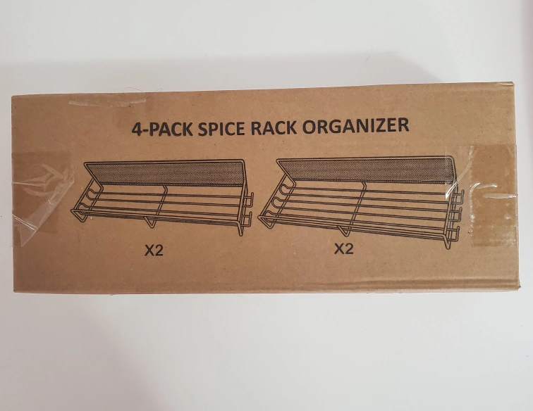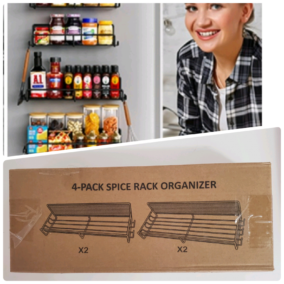 New in box. Four-pack spice rack organizer. Metal construction. Wall-mounted. Great for organizing spices and other pantry items.