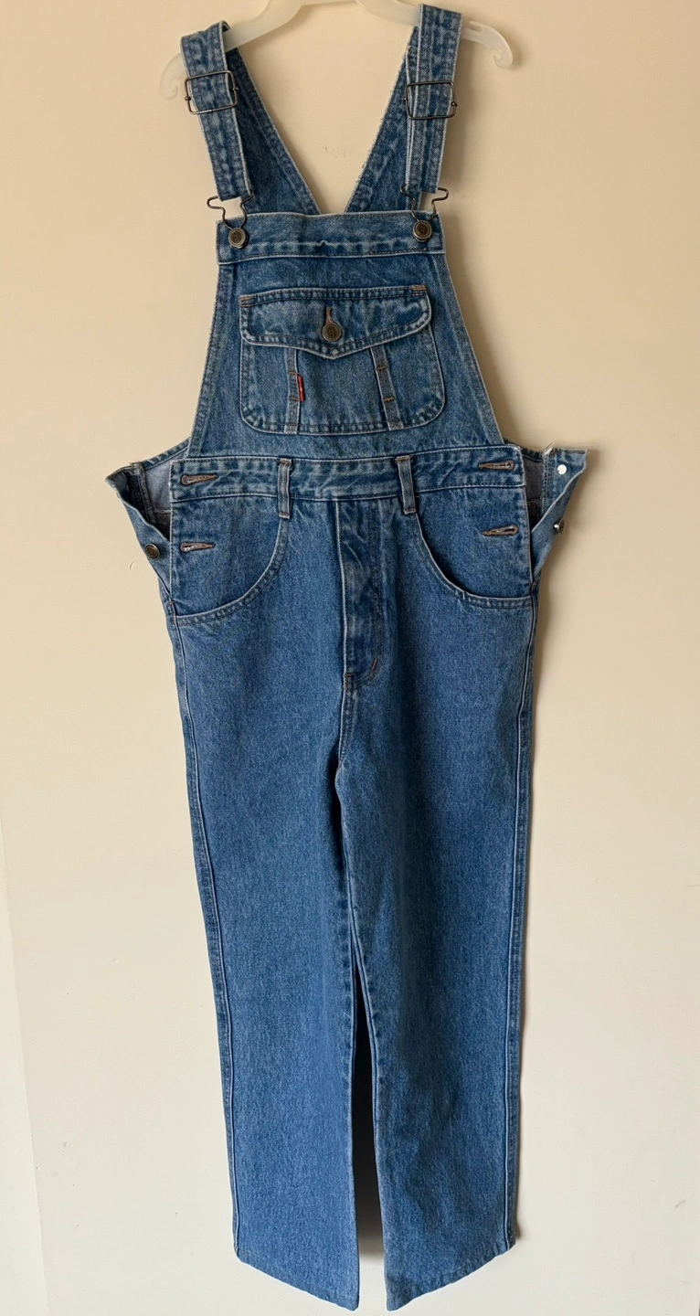 Light blue denim overalls. Classic style, adjustable straps. Excellent condition. Perfect for casual wear. Size 6. Brand: Rego. Waist : 76 cm (30”); In-seam: 60 cm (23.5”).