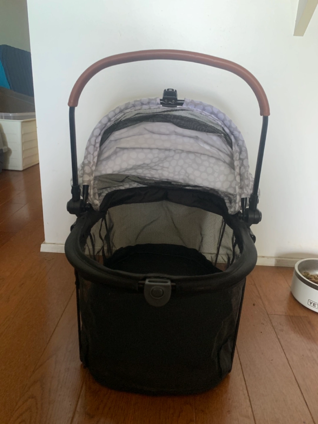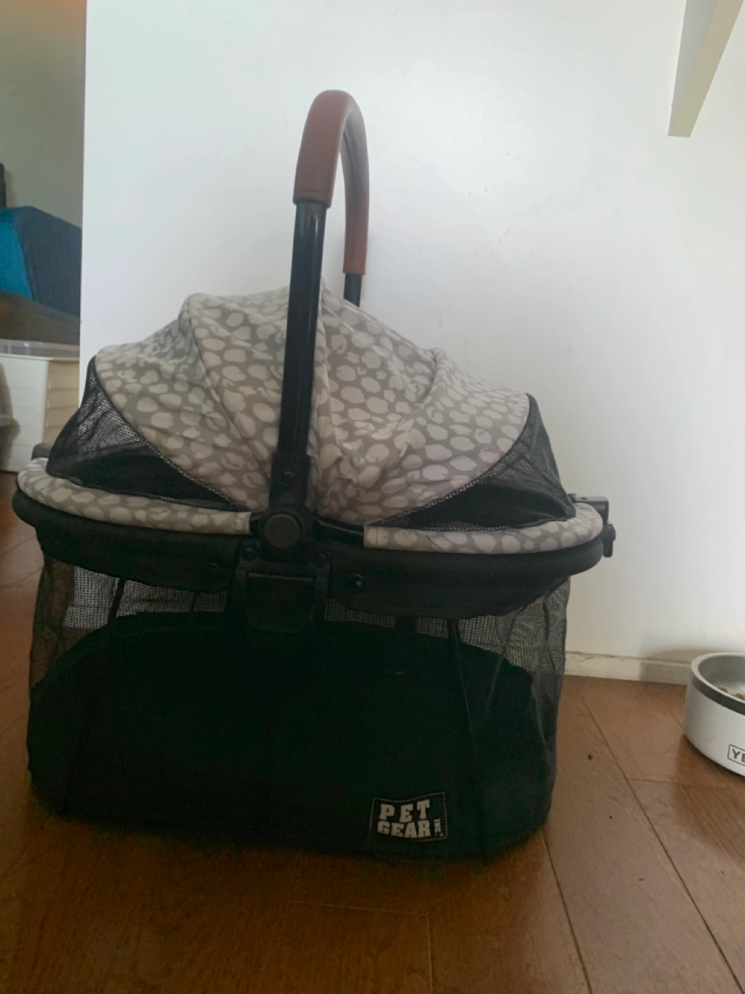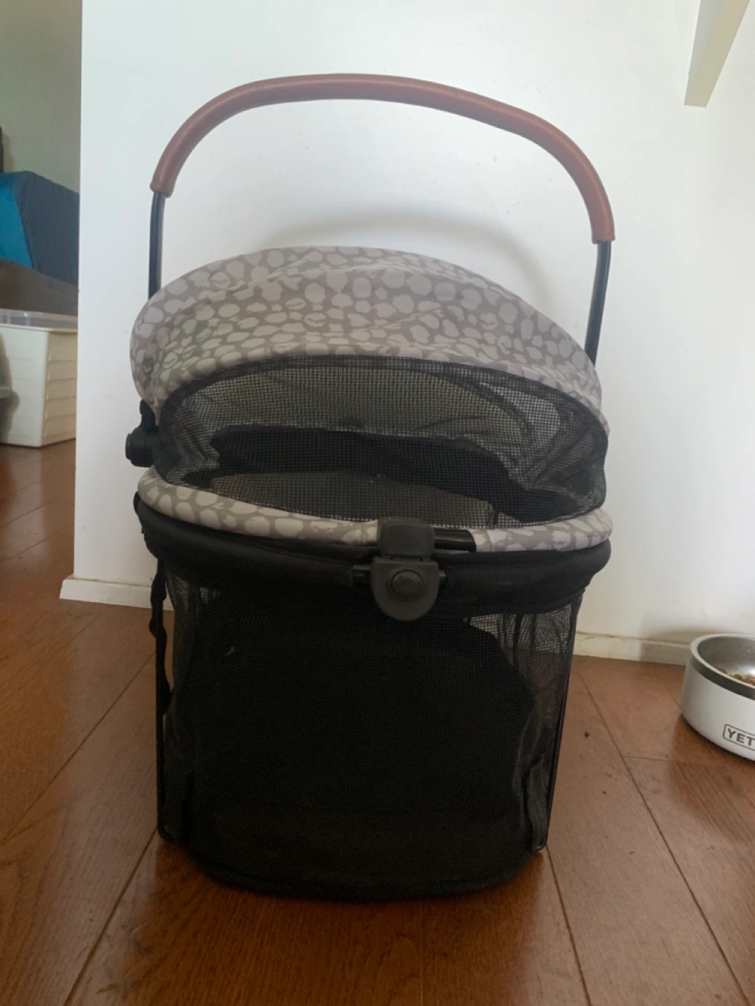 Grey and black pet carrier. Collapsible design. Features a convenient carrying handle and mesh sides for ventilation. Ideal for small pets.