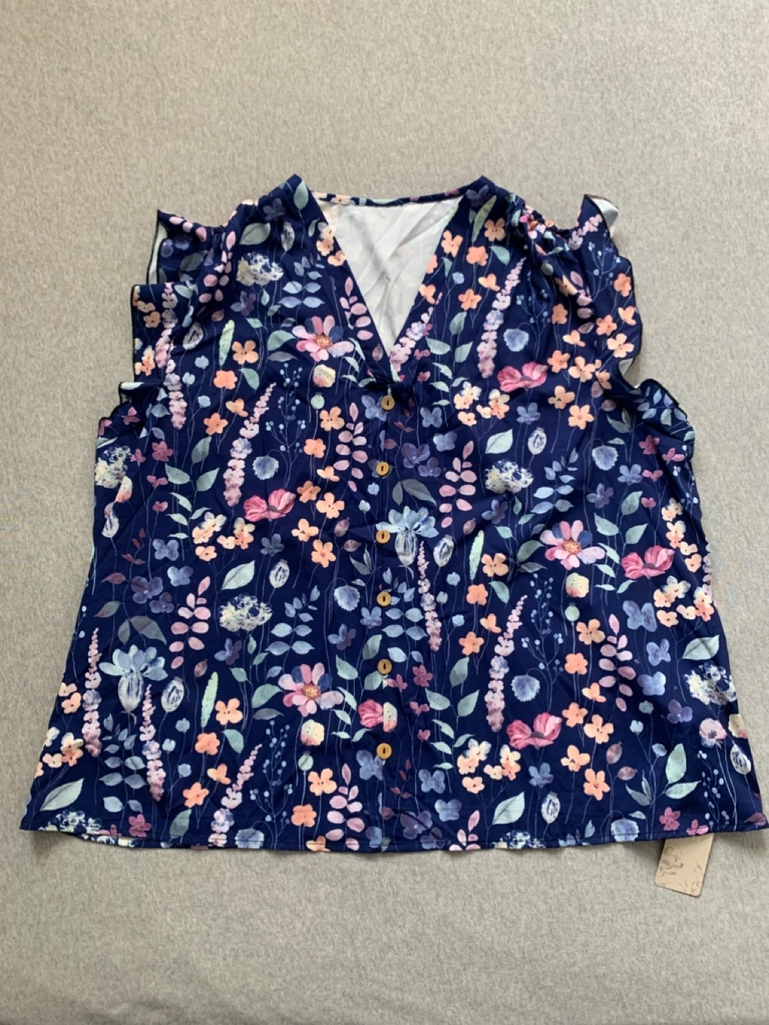 Brand New With Tags Navy blue pullover blouse with a vibrant floral print and scalloped cap sleeves. Features a V-neck and faux button-up front.