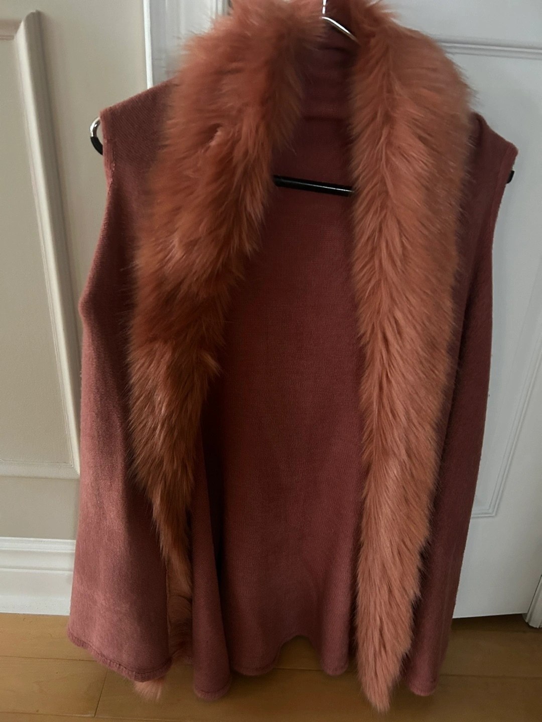 Women's sleeveless knit vest. Dusty rose/copper colour. Features a faux fur collar. Relaxed fit. Open front.