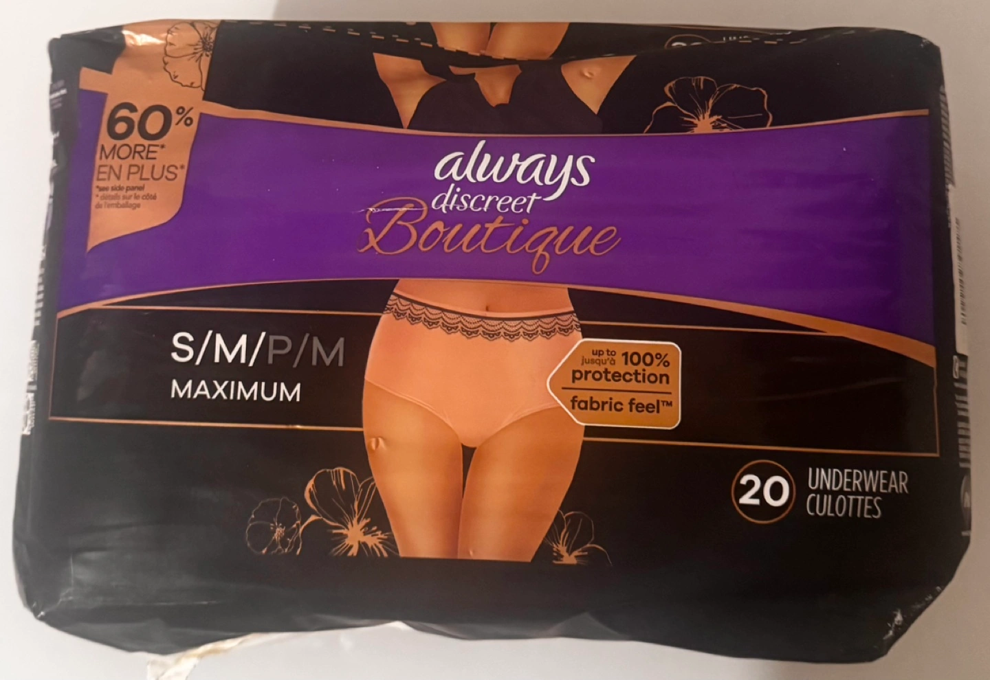 Always Discreet Boutique underwear culottes. Maximum absorbency. Size small/medium/plus/medium. Twenty count package. Up to 100% protection. Fabric feel.