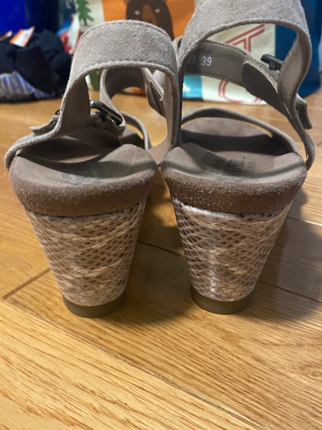 Wedge sandals, beige suede upper. Snakeskin-patterned wedge heel. Adjustable ankle strap with buckle. Size 39.