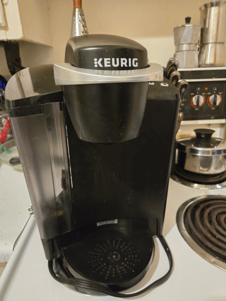 Used Keurig single-serve coffee maker. Black with silver accents. Includes power cord. Virtually no wear at all.