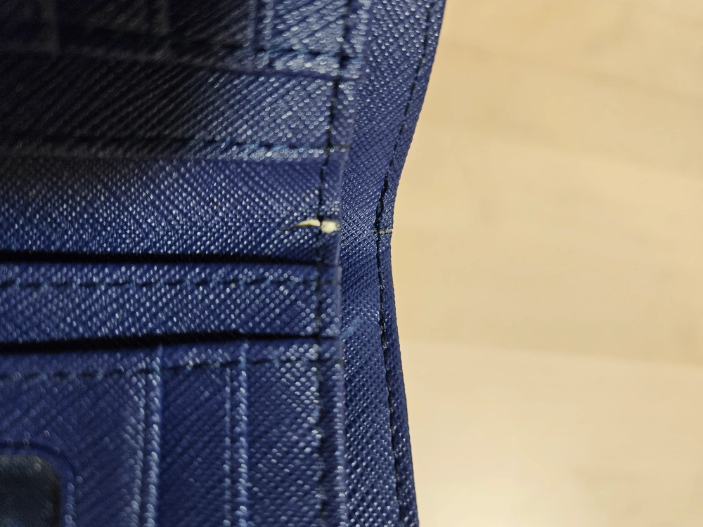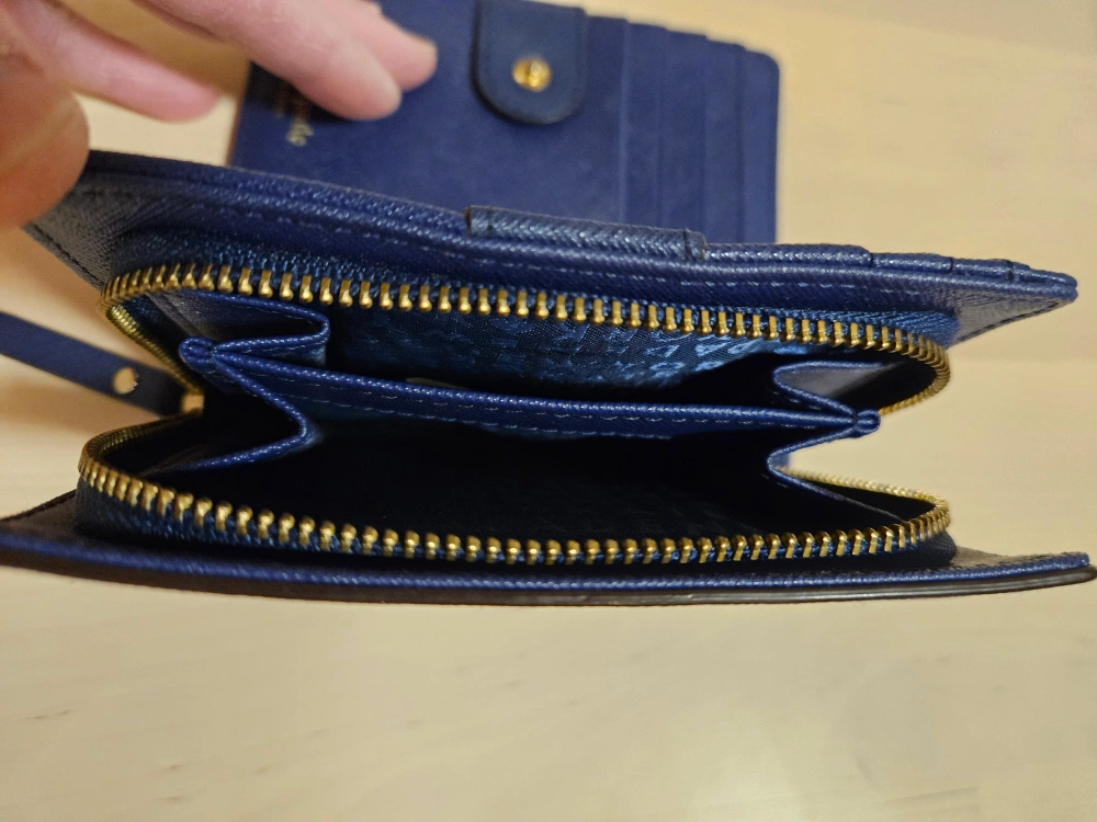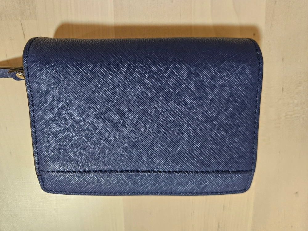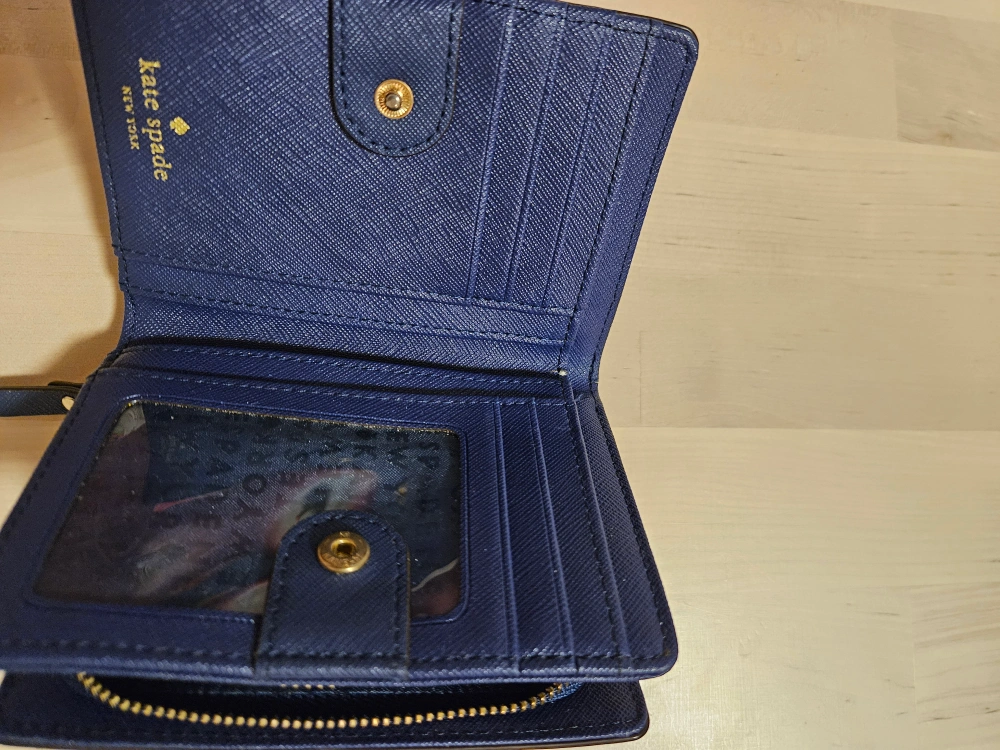Compact wallet, navy blue, zip closure. Multiple card slots and a clear ID window. Gold-toned hardware. Pre-owned in good condition. Except there is a minor crack on the inside (see photos 5).