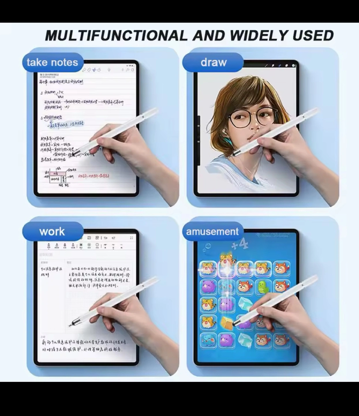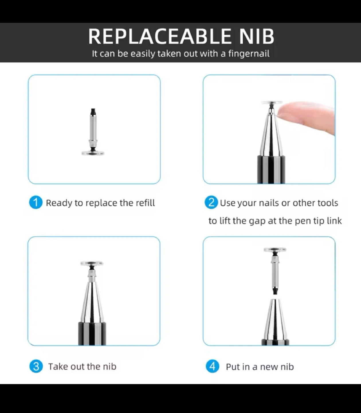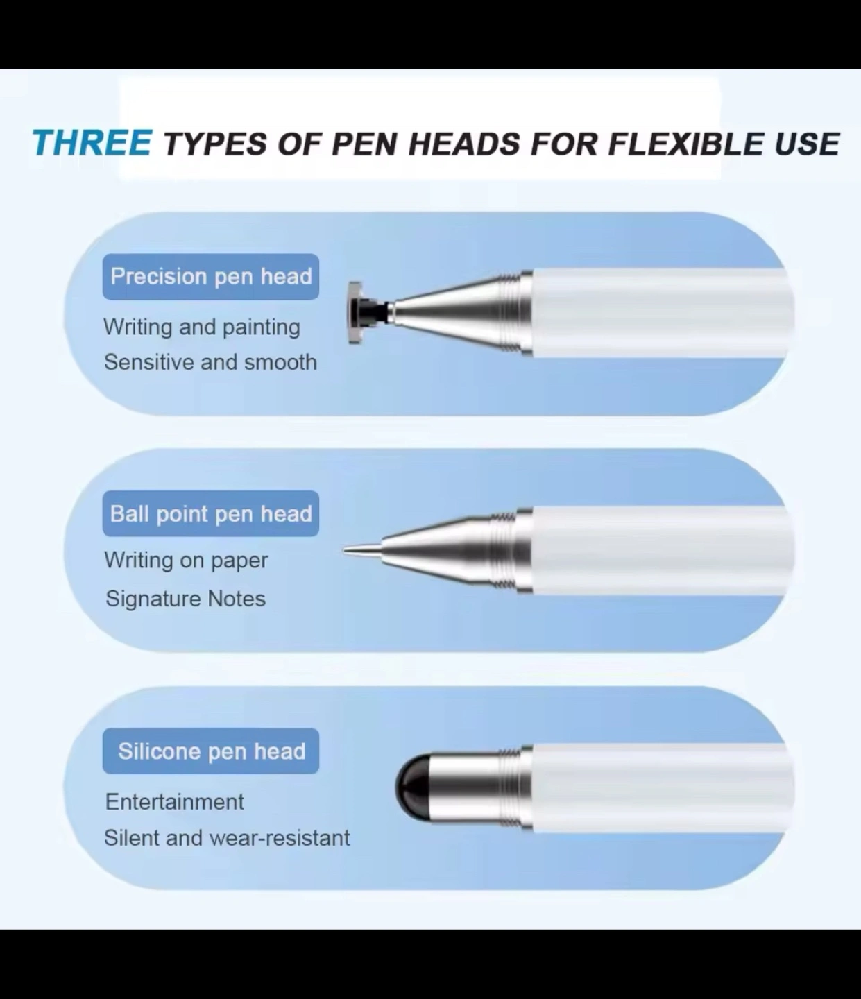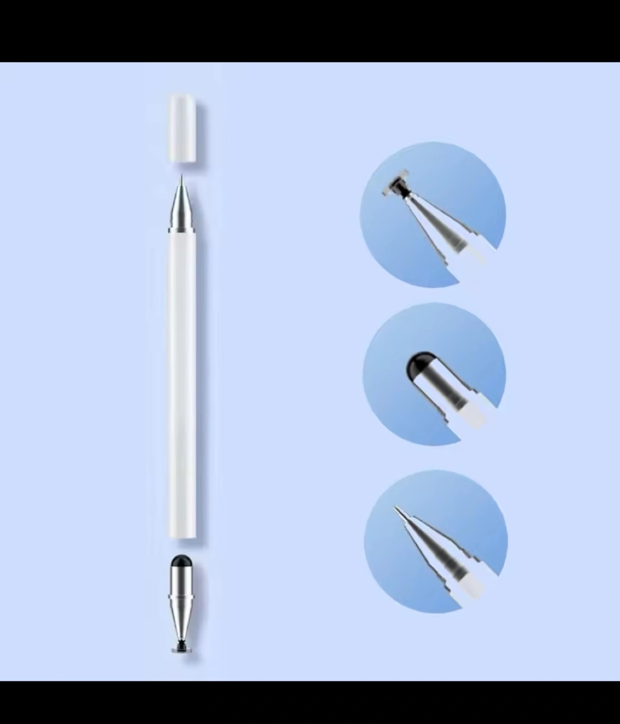 Three interchangeable tips: fine point, disc, and stylus. White body, silver accents. Lightweight and portable. Great for tablets and smartphones.