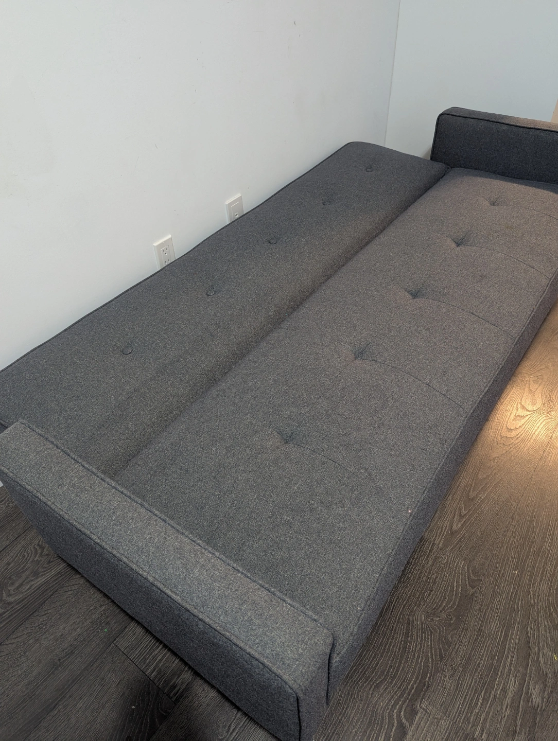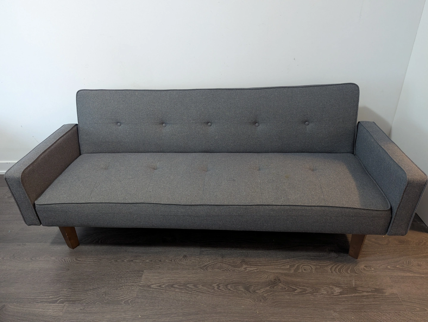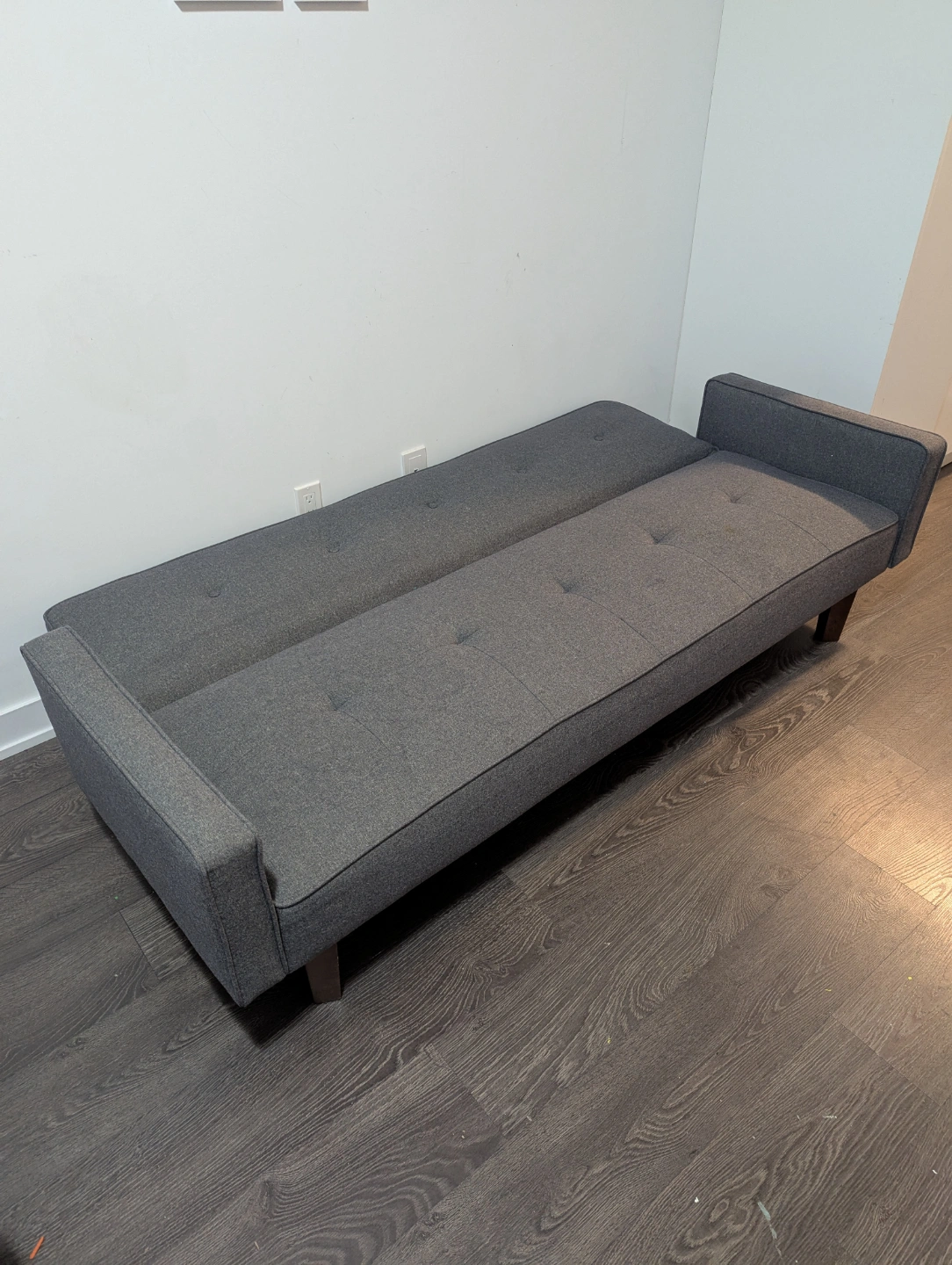 Dark grey fabric futon. Wooden legs. Button tufting. Pull-out bed. Good condition.