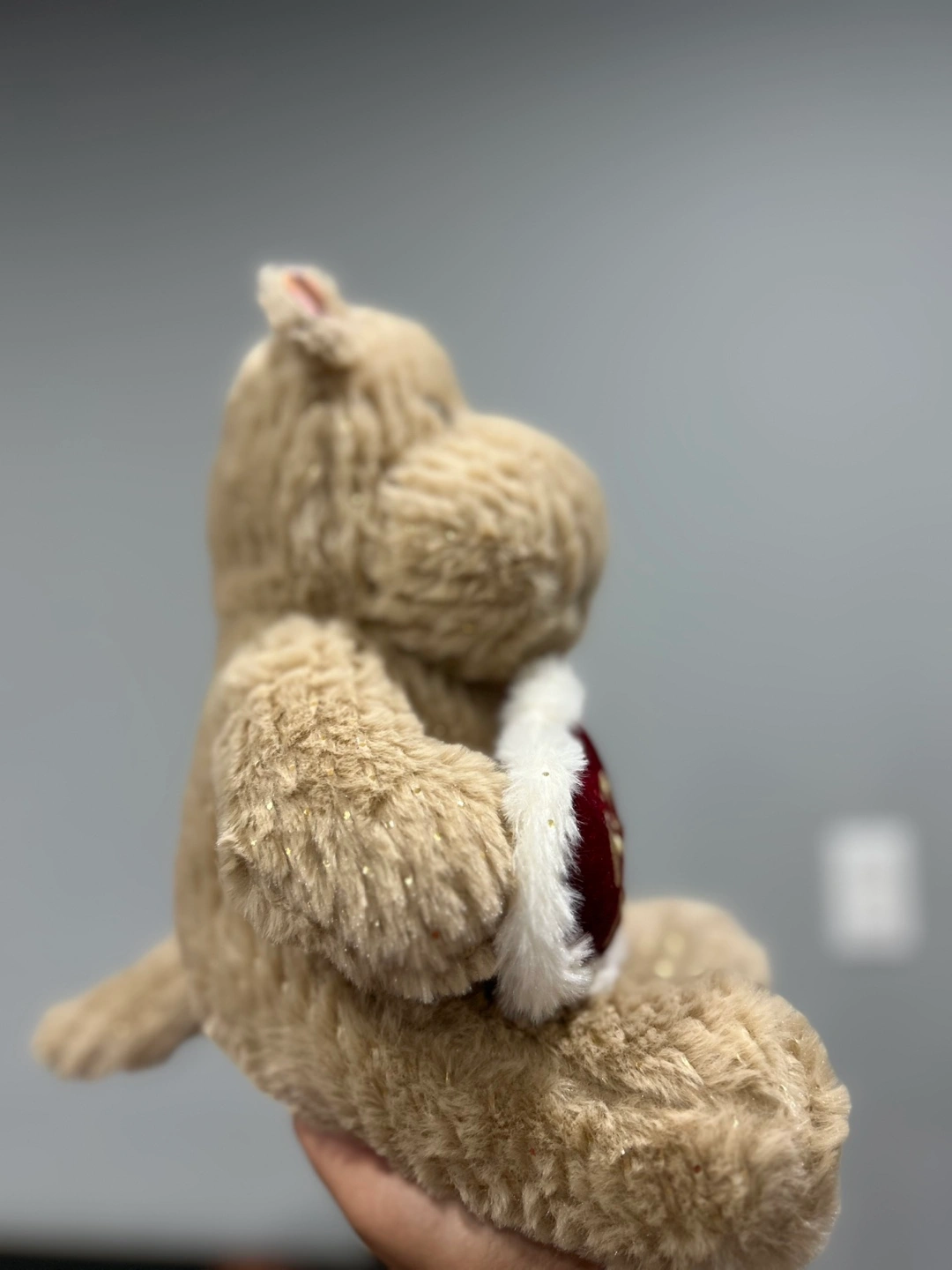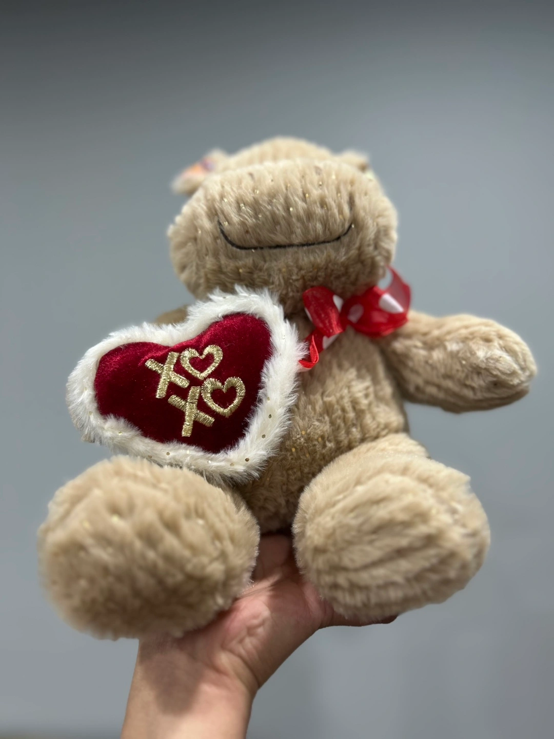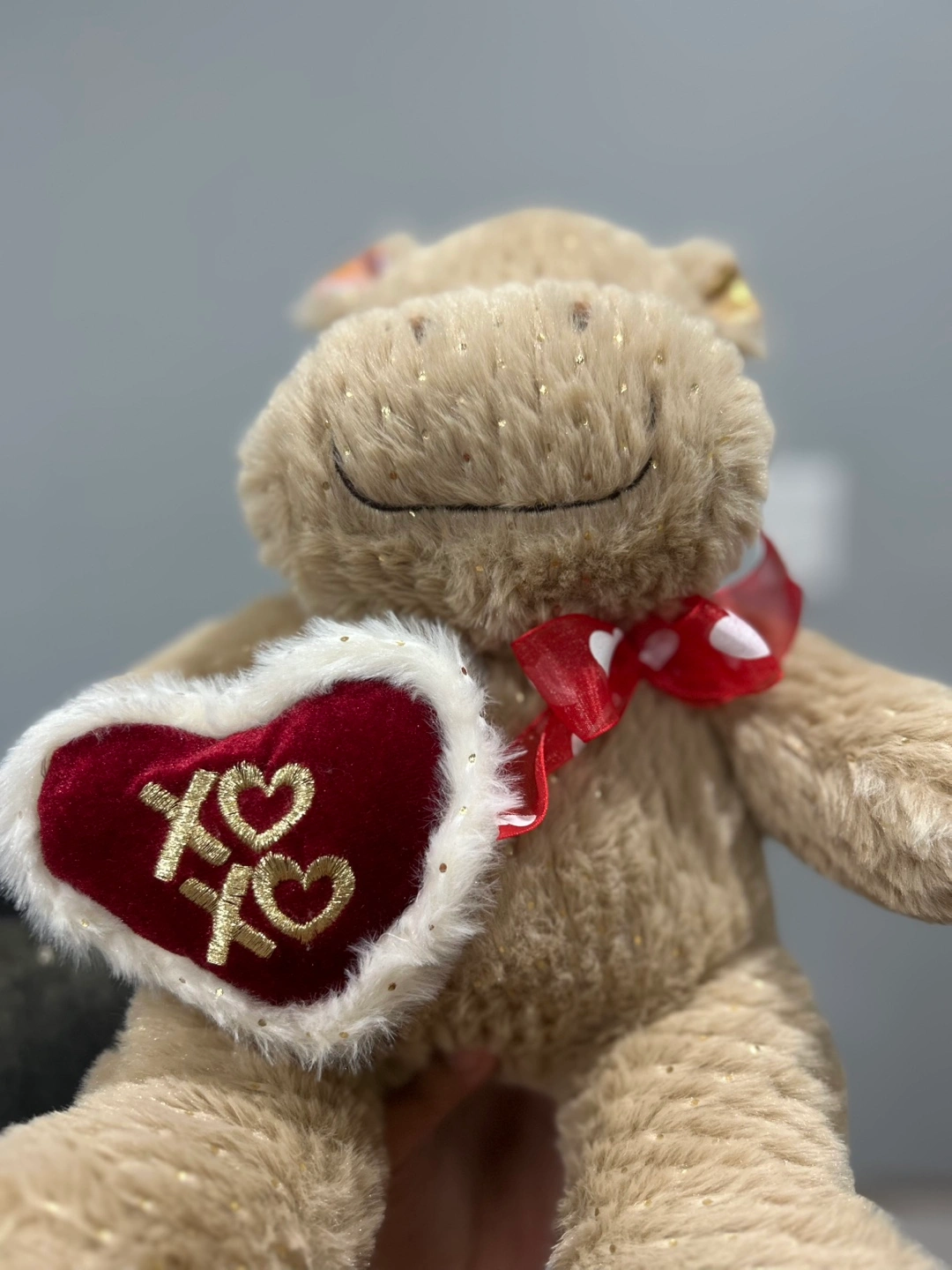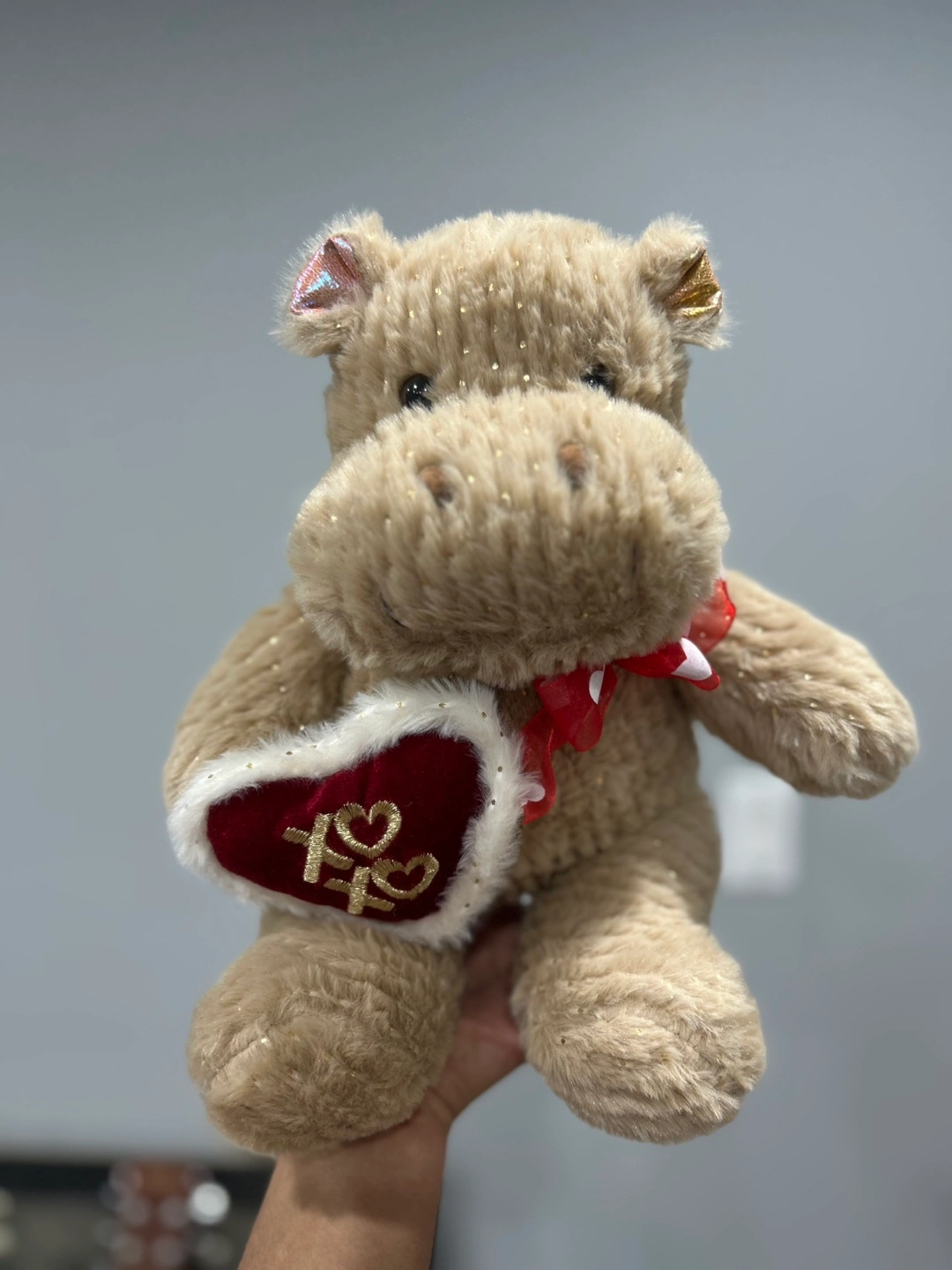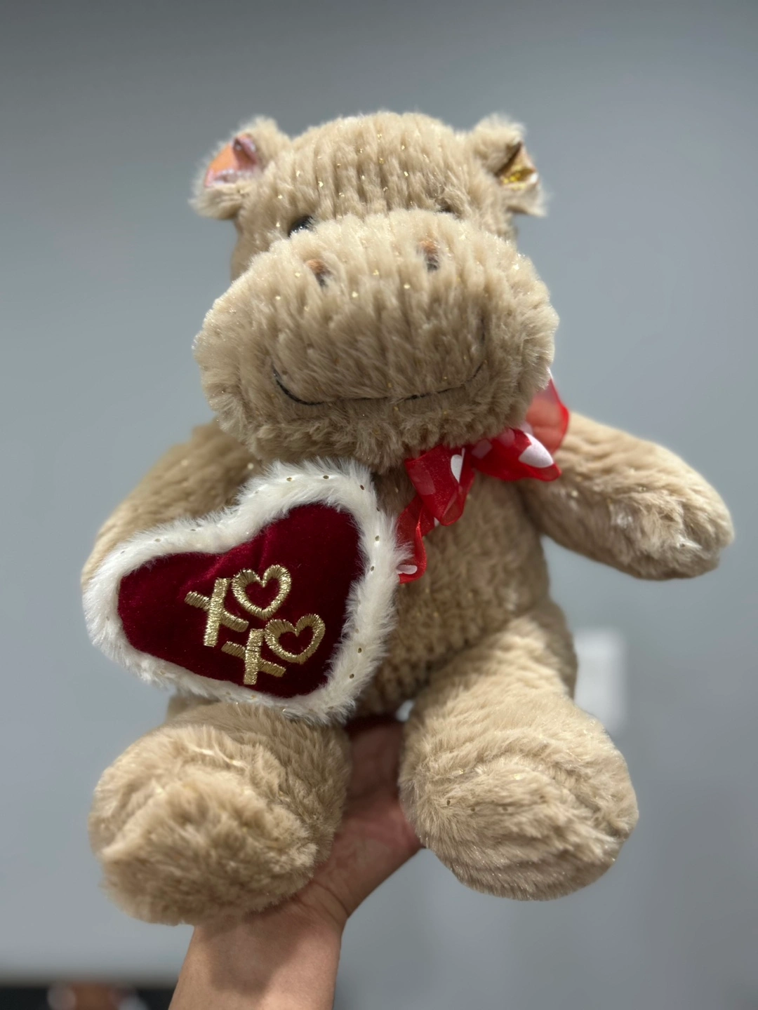 Super cute and cuddly hippo plushie! This sweet stuffed animal features textured tan fur with subtle sparkly threads woven throughout. It’s holding a dark red plush heart with "XO" embroidered in gold and is wearing a festive red and white polka dot ribbon. Perfect as a Valentine's Day gift, anniversary present, or just a sweet surprise for a loved one!