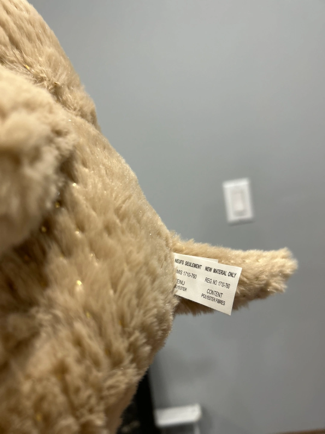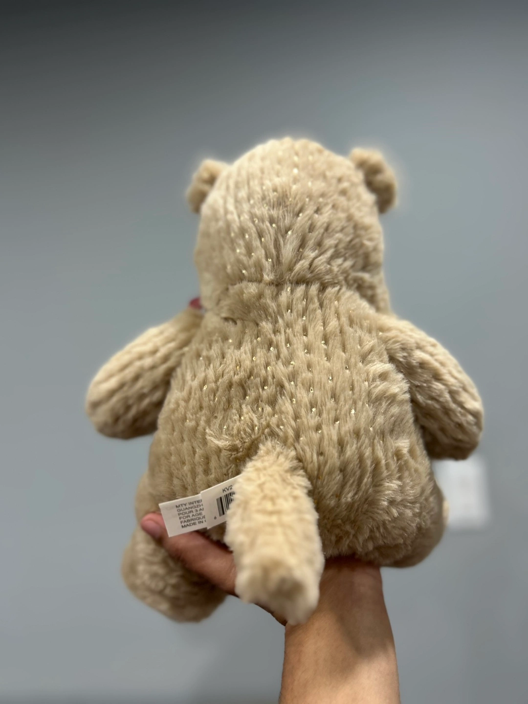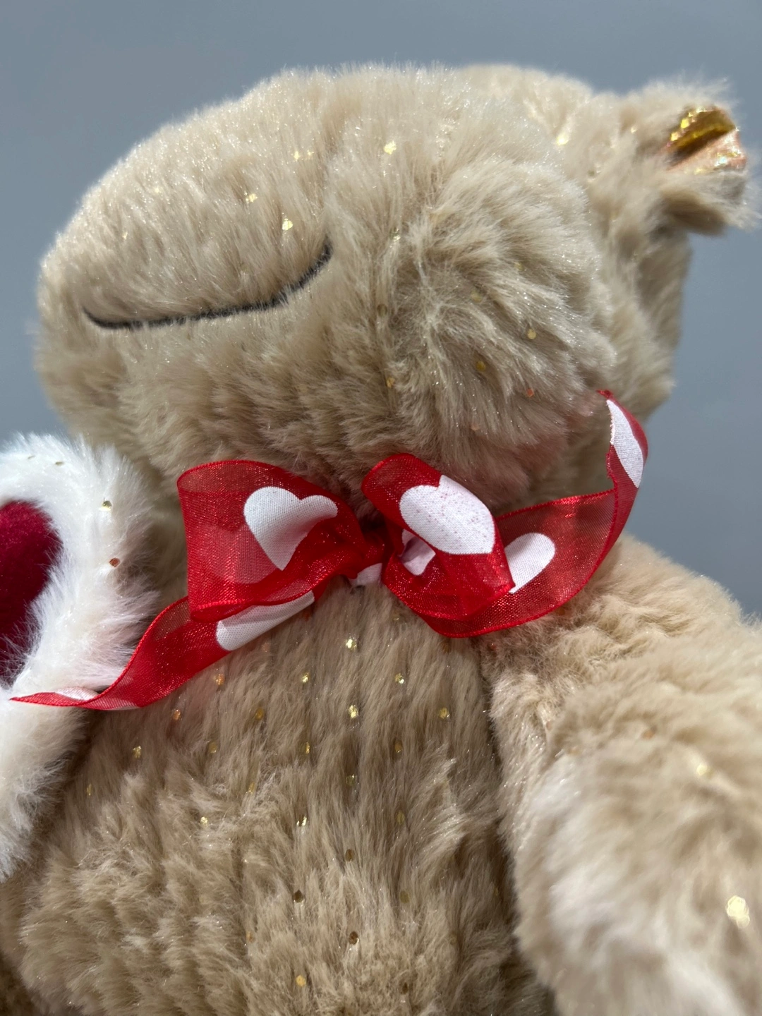 Ribbed plush texture, metallic sparkle accents, embroidered heart, and ribbon collar.