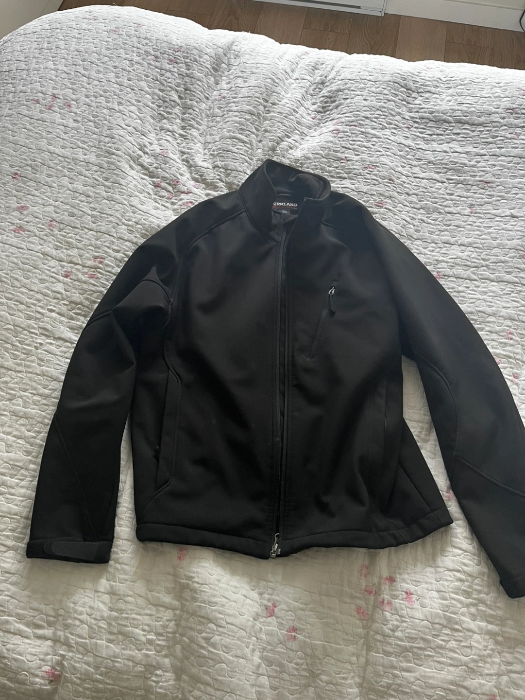 Men's black softshell jacket. Full zip closure. Features zippered pockets. Long sleeves. Great for layering.