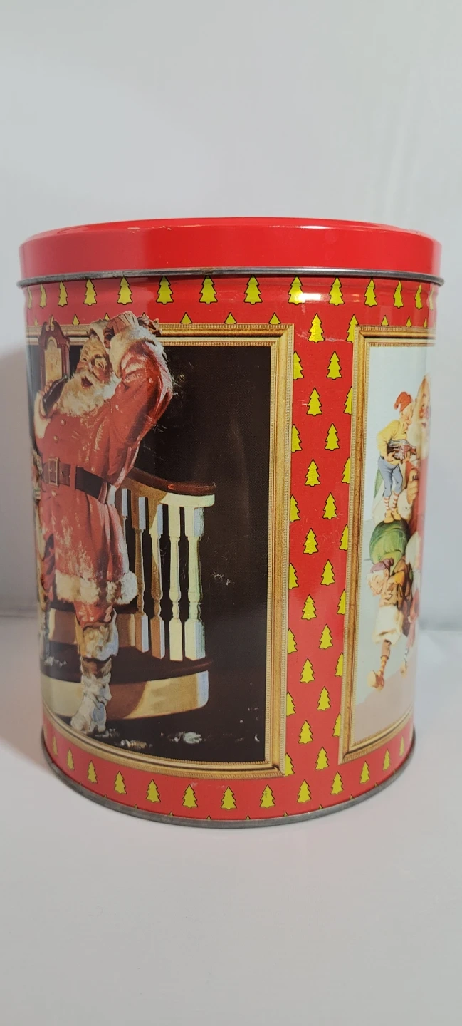 Retro Coca-Cola tin featuring classic Santa Claus artwork. It's perfect for storing holiday treats or seasonal decorations. This tin has a vibrant red lid and sides decorated with festive Christmas trees.