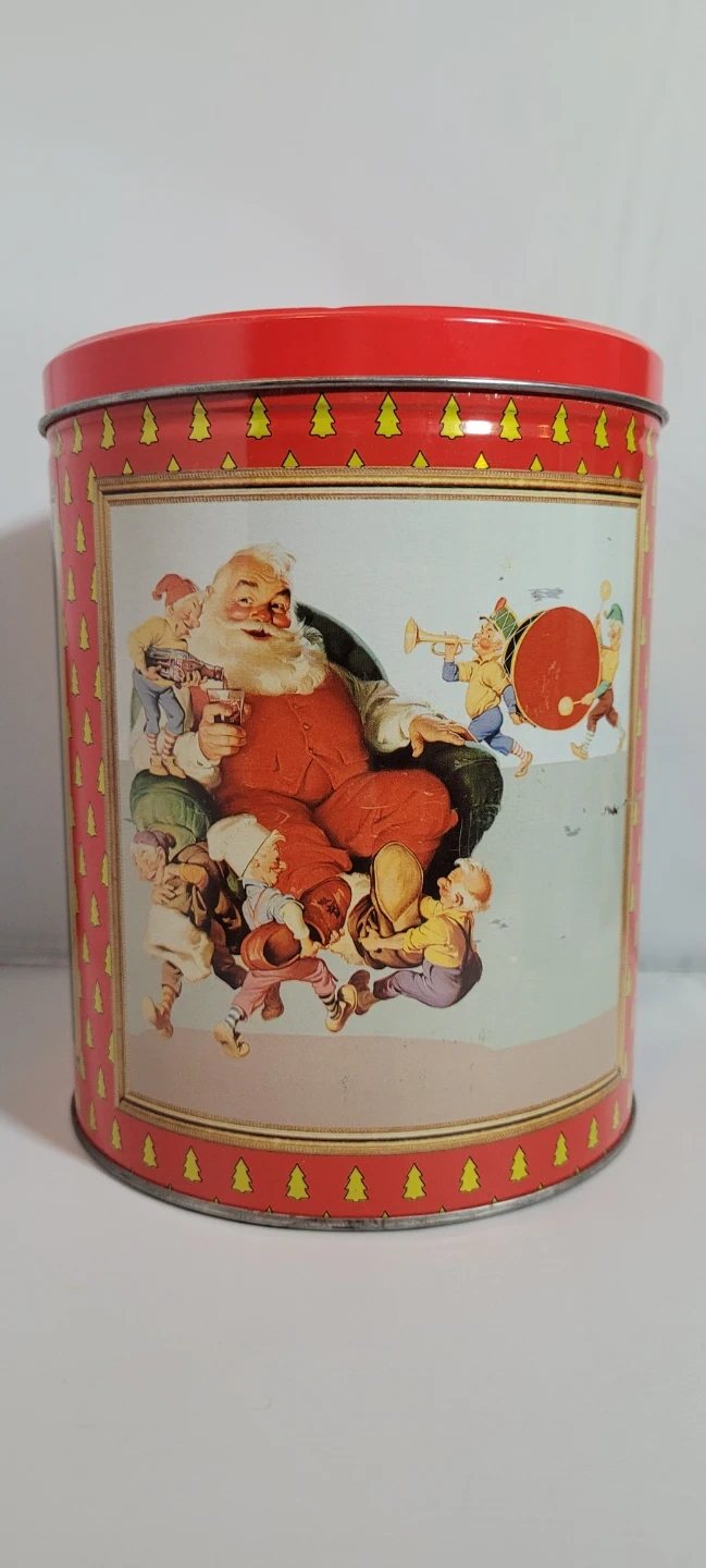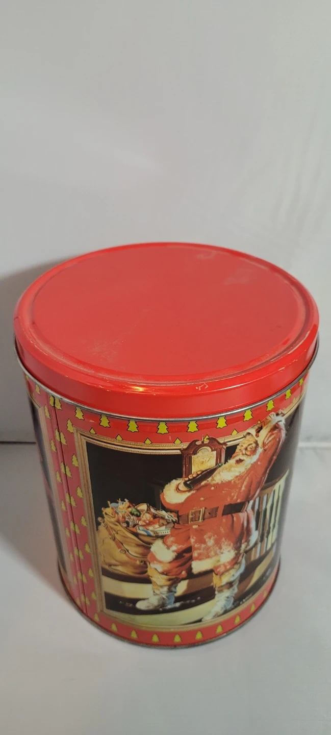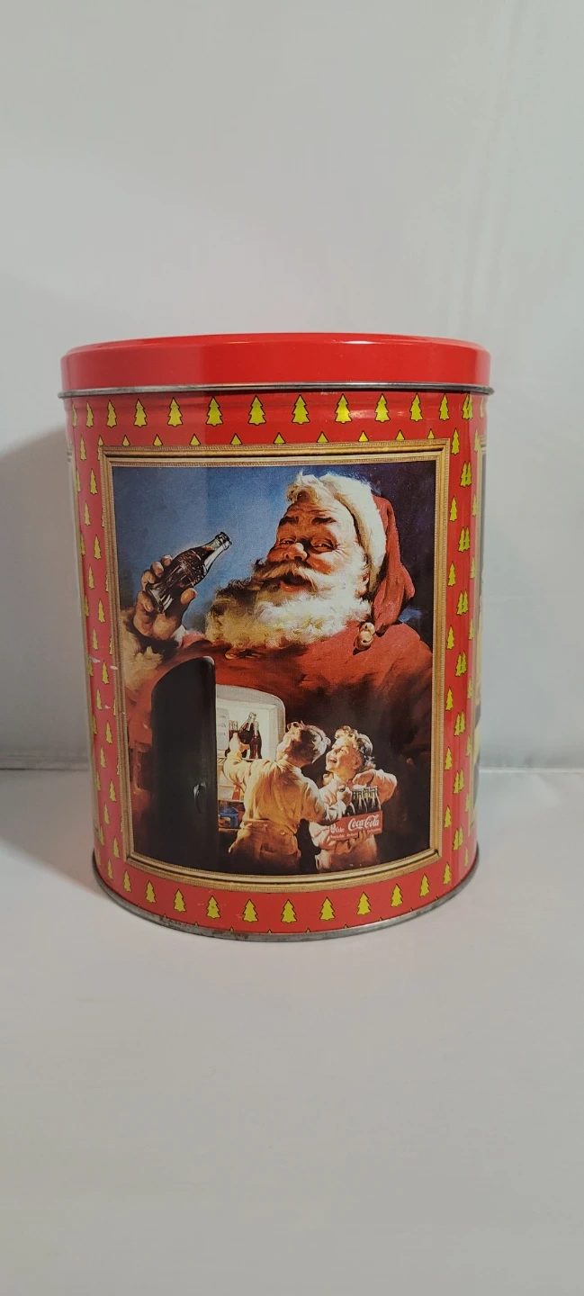 Retro Coca-Cola tin featuring classic Santa Claus artwork. It's perfect for storing holiday treats or seasonal decorations. This tin has a vibrant red lid and sides decorated with festive Christmas trees.