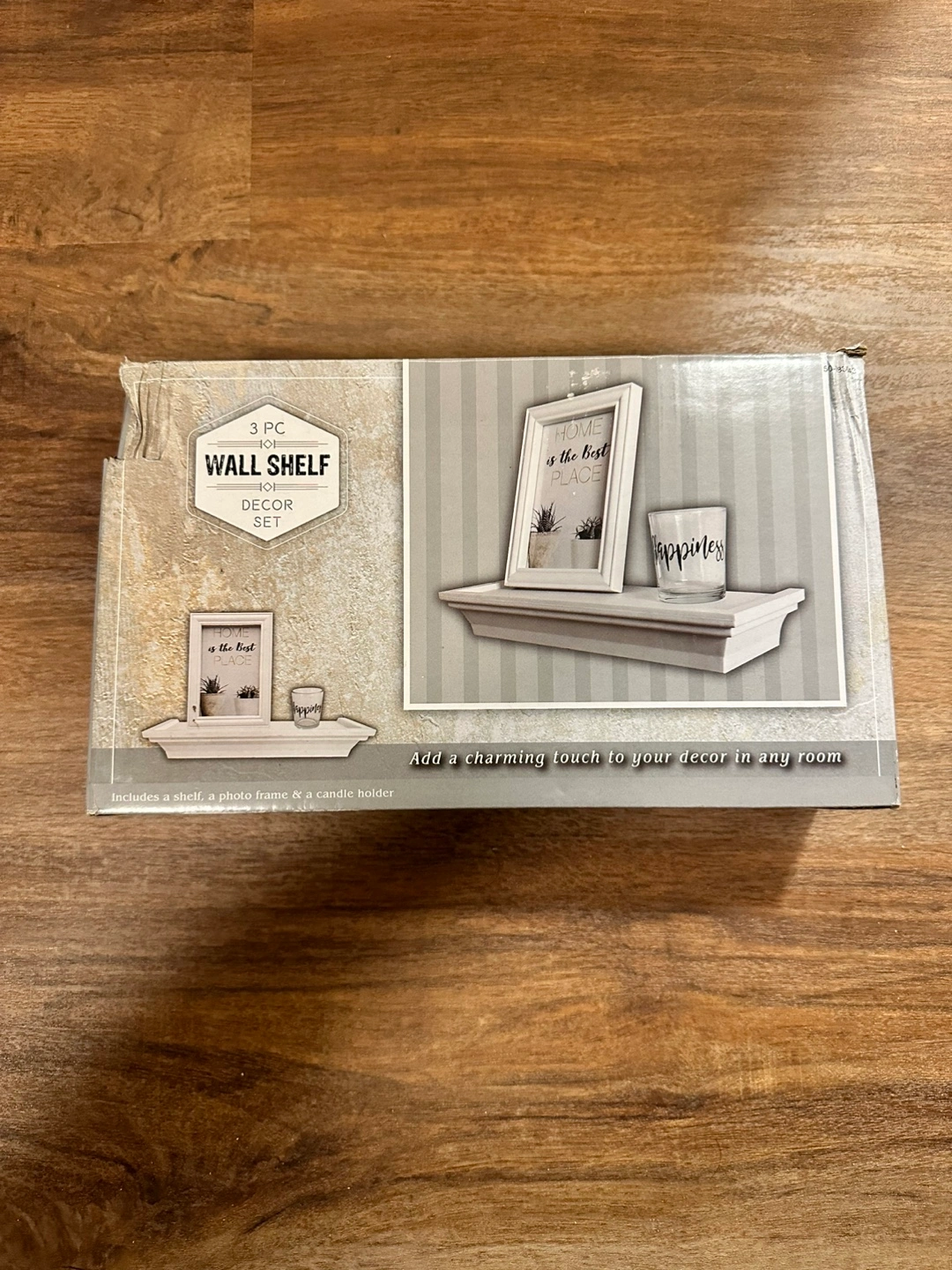 White wall shelf set. Includes shelf, photo frame, and candle holder. Charming décor for any room.