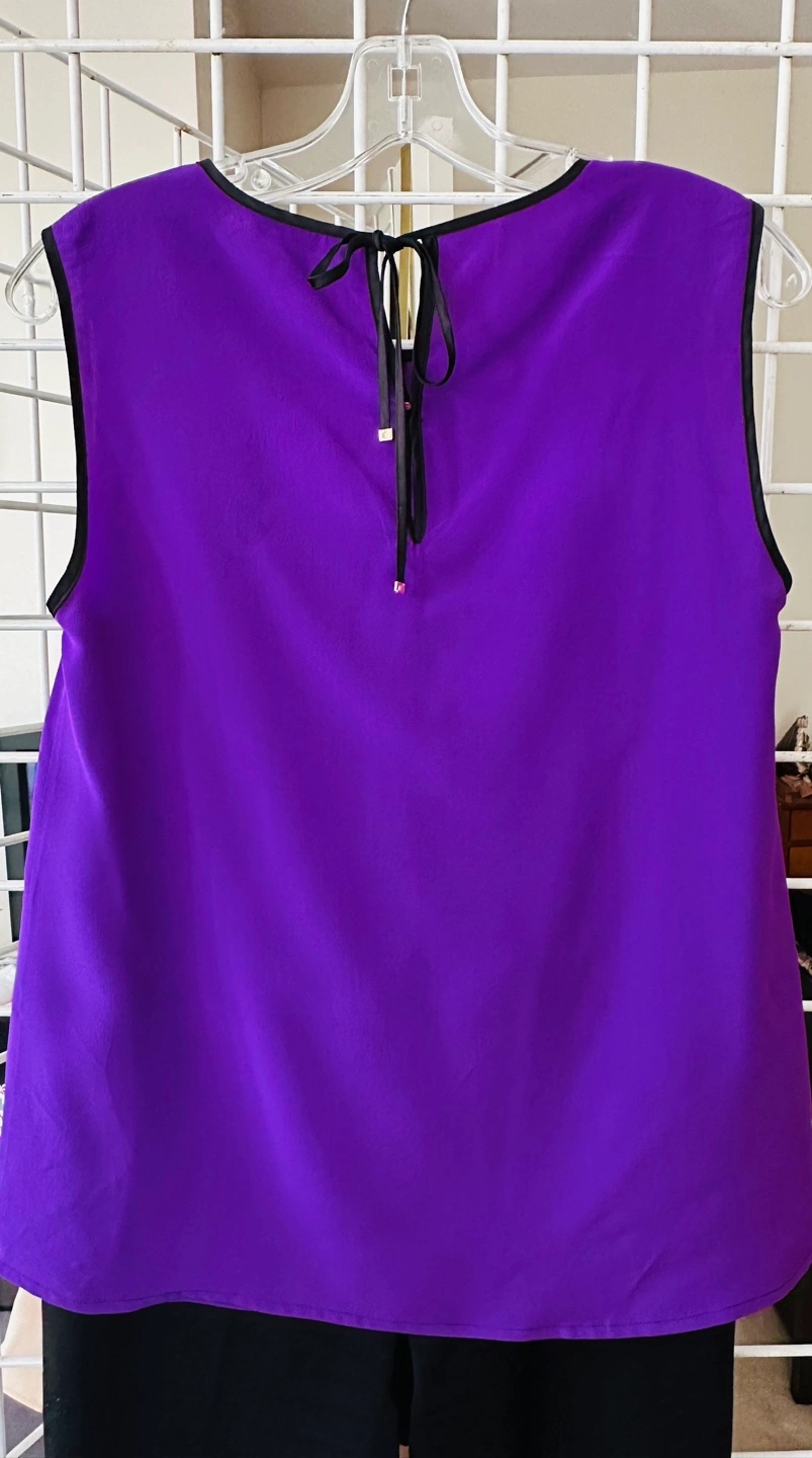 Purple sleeveless blouse. Size large. Black trim. Back tie detail. Made in China.