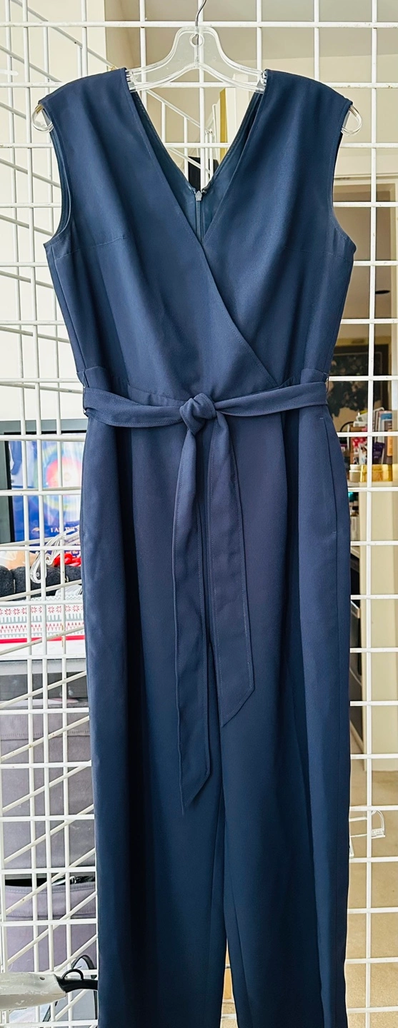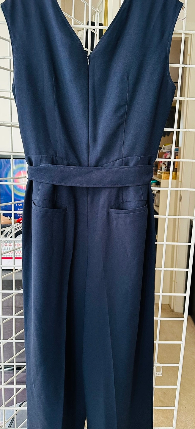 Sleek navy blue jumpsuit. V-neck sleeveless design. Wide-leg silhouette. Features a self-tie belt. Functional pockets. Zip closure at the back.