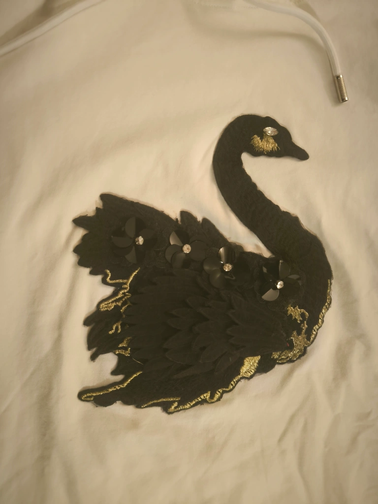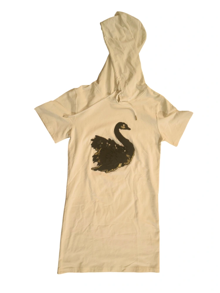 Women Sandro Ivory short sleeve hoodie dress Mini M. Features a large black swan embroidered with gold detailing.