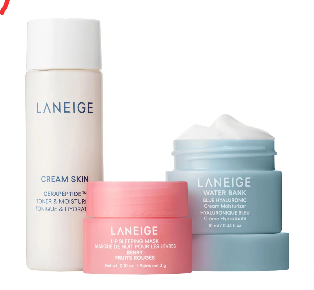 85LANEIGE skincare set. Includes Cream Skin Ceraptide Toner, Lip Sleeping Mask in Berry, and Water Bank Blue Hyaluronic Cream Moisturizer. Mini sizes, perfect for travel.
