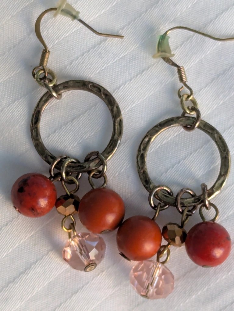 Bronze hoops. Features terracotta coloured beads and pale pink crystal accents. Lightweight and stylish.
